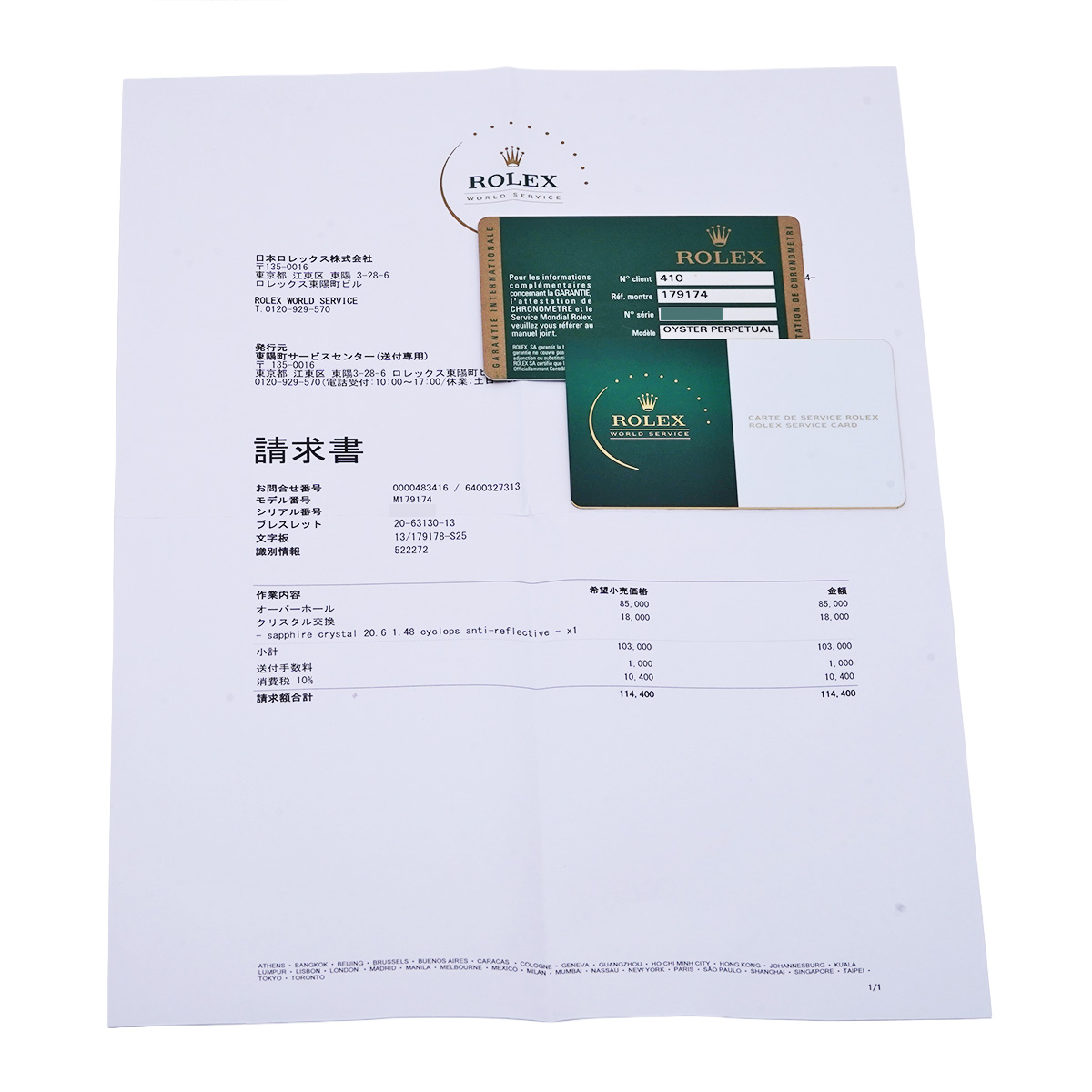 - メーカー保証書( 2010年8月国内購入) / メーカー箱(ダメージ)/冊子 / 請求書(2025年8月オーバーホール他) サービスカード(有効期限2027年9月)