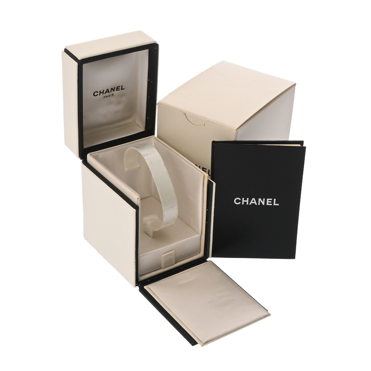 香水No.5のボトルストッパーを象ったケースシェイプ、ハンドバッグのチェーンを思わせる、レザーを編み込んだしなやかなチェーンブレスレット、そしてシャネルを象徴するカラーであるブラックとゴールド。