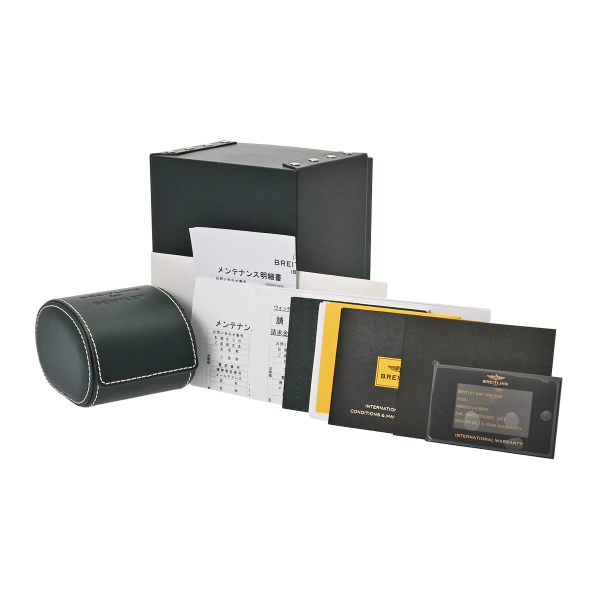 - メーカー保証書( 2019年6月国内購入) / メーカー箱(ダメージ)/冊子/クロノメーター証明書/限定書 / メンテナンス明細書(2020年12月メンテナンスサービス)、メンテナンス明細書/請求書(2025年9月ベルト交換)