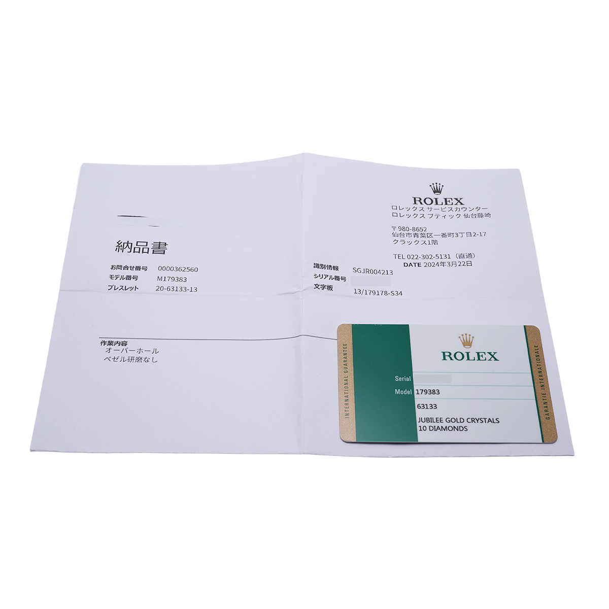 - メーカー保証書( 2016年5月海外購入) / メーカー箱(劣化)/冊子/タグ / 納品書(2024年3月オーバーホール)