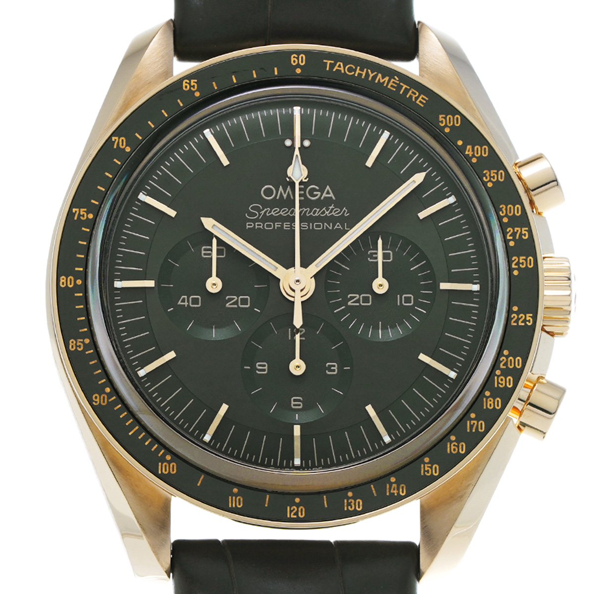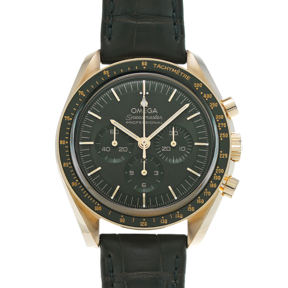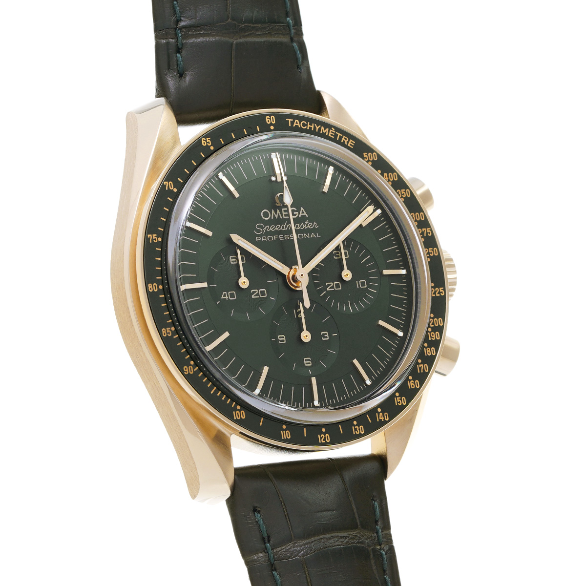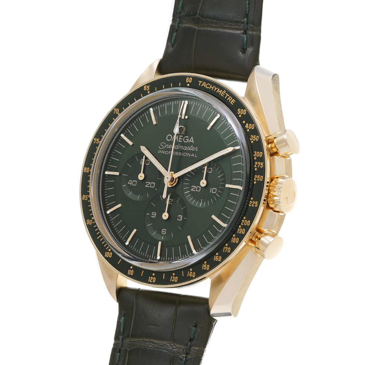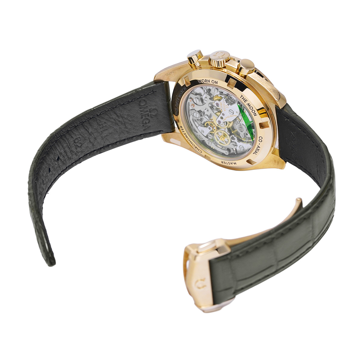 オメガ独自の18Kムーンシャインゴールド製ケース、グリーンPVDダイアル、グリーンアリゲーターストラップ仕様のハイエンドモデル。