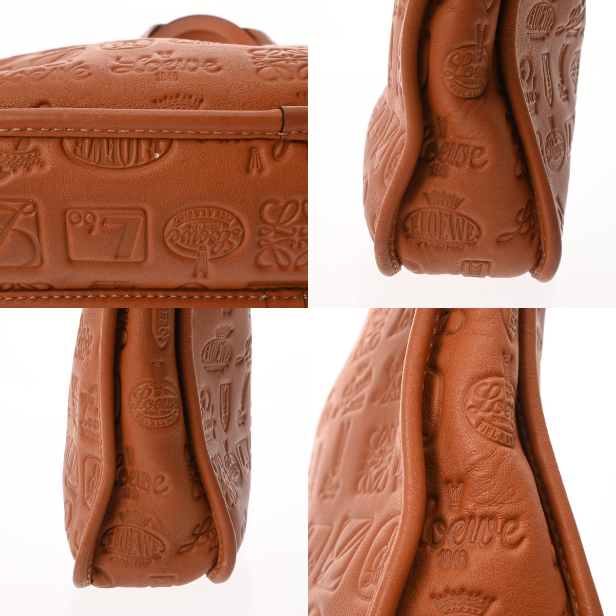 - つぶれ、若干たたみクセ、シワや汚れ、角含めスレ、持ち手のコバにヒビ割れ、金具にスリキズなど使用感が少しございます。