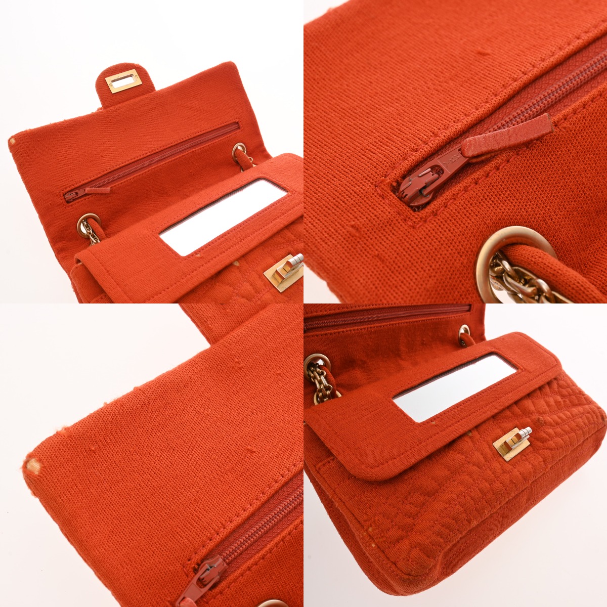 破れ、糸のほつれ、毛羽立ち、スレや汚れ、ミラー部分糊の剥がれやキズ、ファスナープルにクセ、金具にメッキ剥がれやスレキズなどがございます。