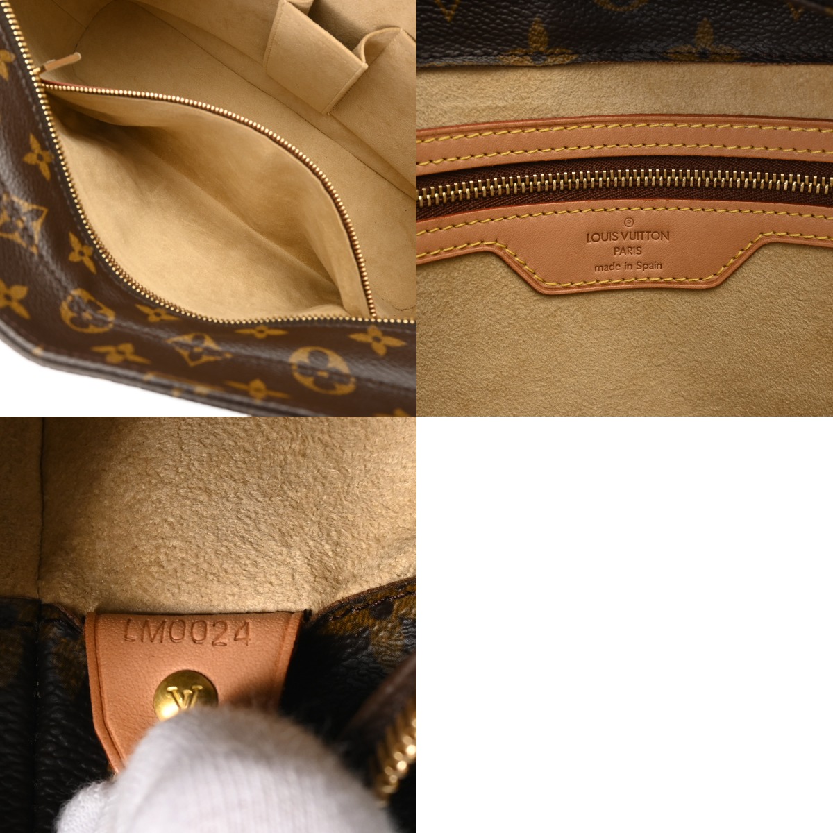 - 若干つぶれ、スレ、若干汚れ、バッグ口にヨレ、ヌメ革にシミやシワ、シワ、コバに若干毛羽立ち、金具にくすみやスレキズがございます。