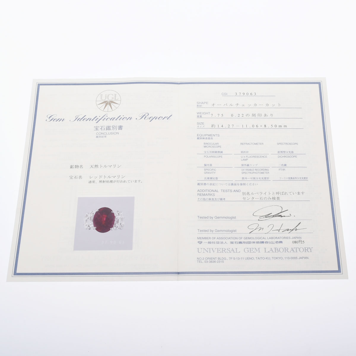 - 鑑別書 / レッドトルマリン ※通常、照射処理が行われています。