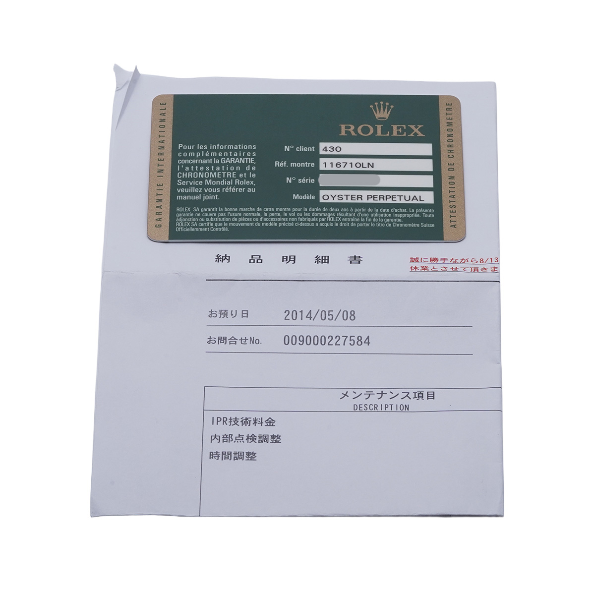 - メーカー保証書( 2011年3月海外購入) / メーカー箱(ダメージ)/冊子 / 納品明細書(2014年7月内部点検調整他)