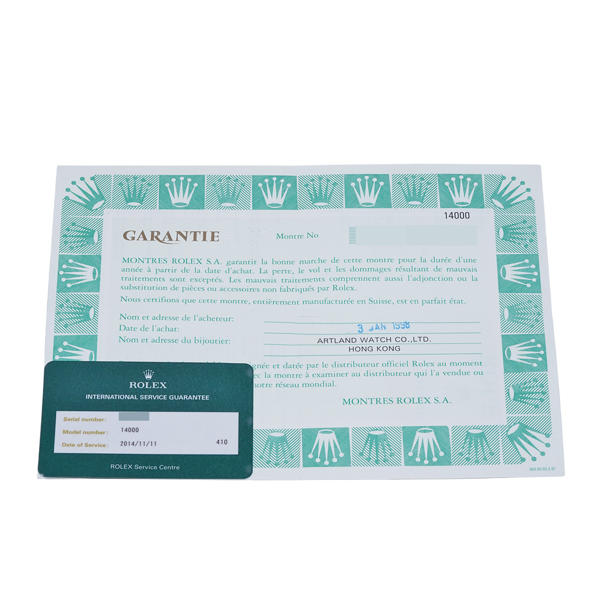 - メーカー保証書( 1998年1月海外購入) / メーカー箱(劣化)/冊子 / 国際サービス保証書(2014年11月オーバーホール)