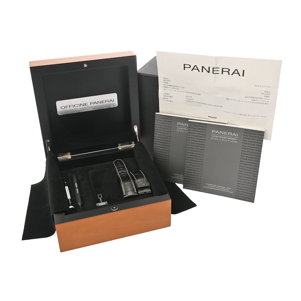 - メーカー保証書( 2014年6月国内購入) / 替えベルト( アリゲーター/ブラック(使用感あり)) / メーカー箱/冊子 / 修理明細書(2024年6月コンプリートサービス)