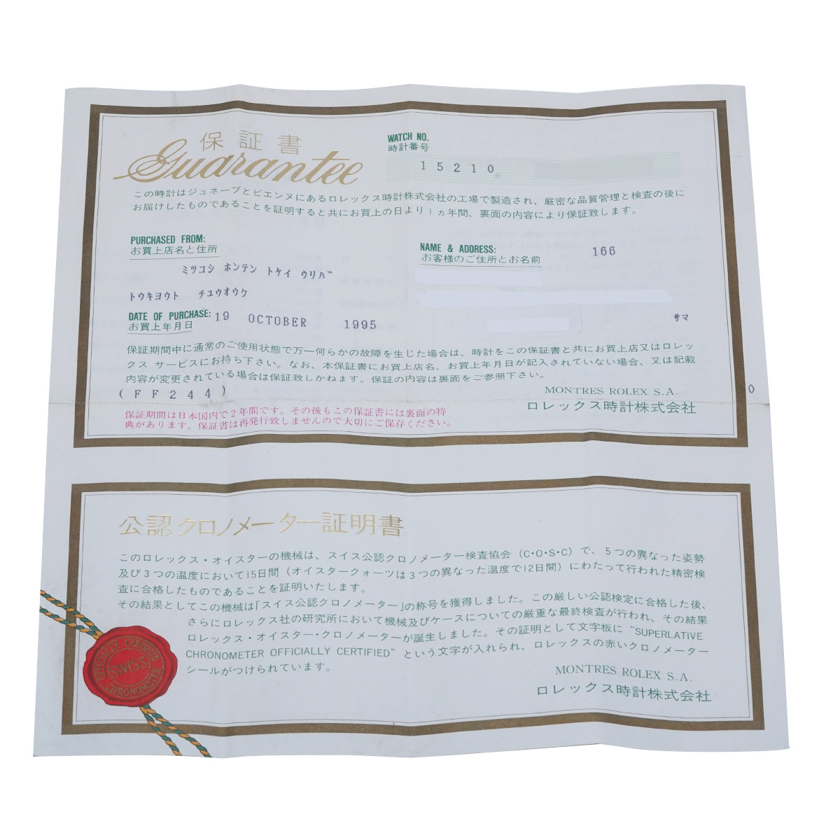 - メーカー保証書( 1995年10月国内購入) / 内箱(劣化)