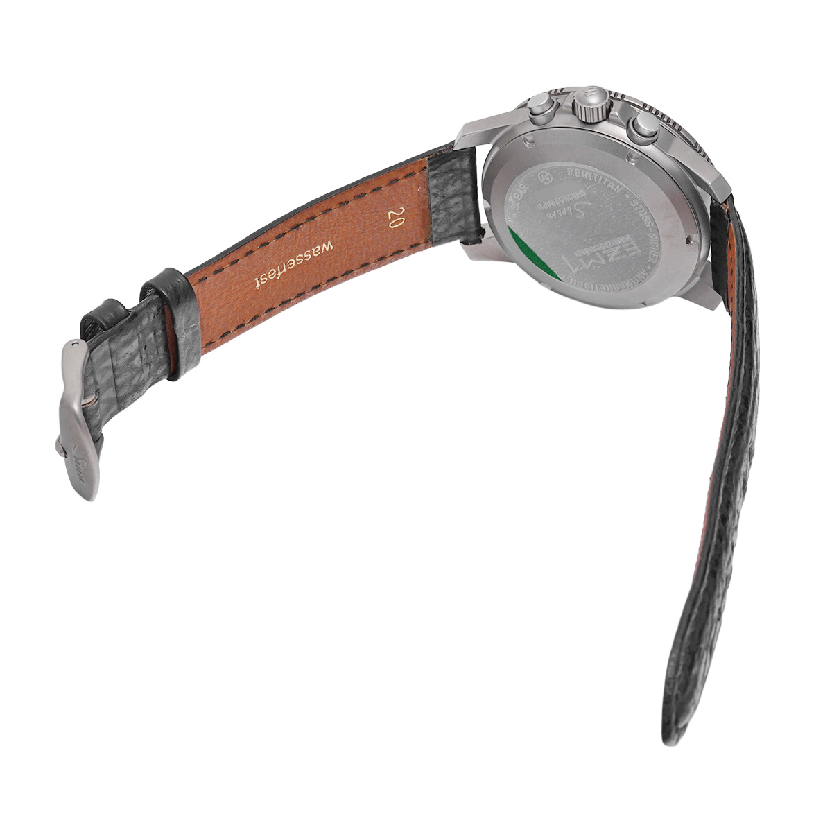 コメントムーブメントには、高い信頼性を誇るレマニア社製キャリバー5100を搭載し、優れた耐衝撃性と確かなクロノグラフ機能を備えています。ケースには軽量かつ耐久性に優れたチタン素材を採用し、長時間の装着でも快適なフィット感を実現。さらに、リューズとクロノプッシャーを左側に配置することで、手の甲への干渉を避け、操作性を高めています。