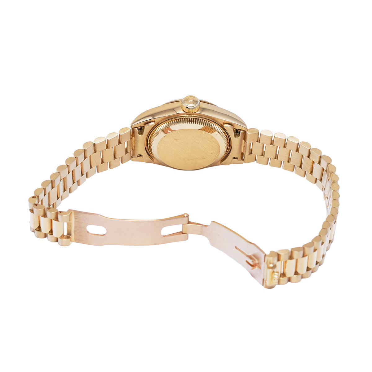 それから四半世紀の歳月を経て進化したこの世代のレディ デイトジャストの中でも、このゴールドモデルはもちろん特別な存在であり、最高峰の証であるプレジデントブレスレットがフィットされているほか、様々なジュエリーピースのベースモデルとして多く用いられています。 -