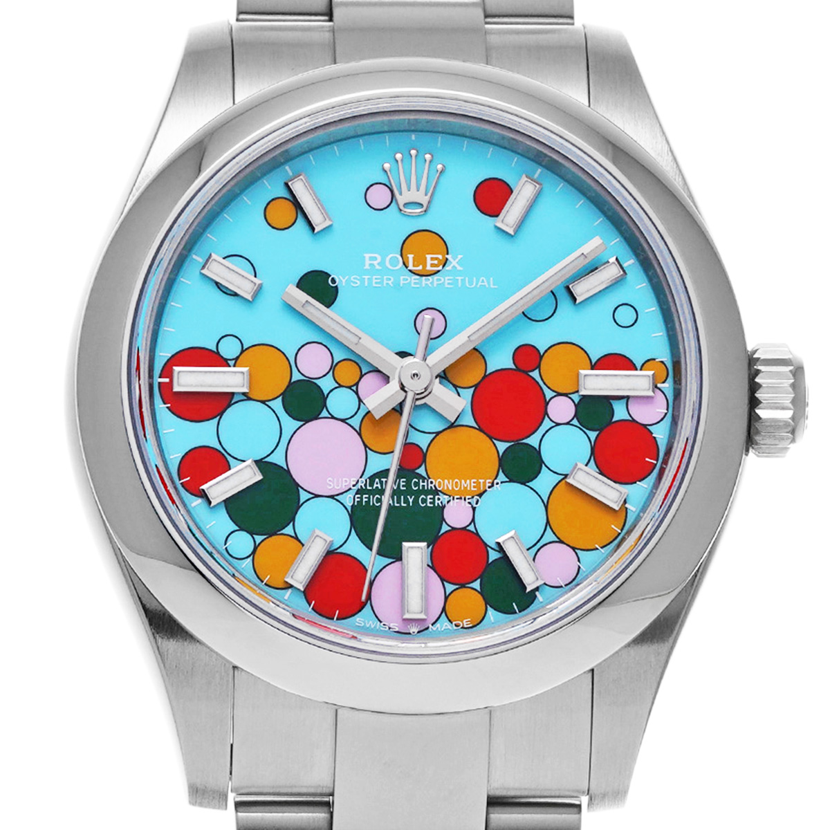 シックなカラーが大半を占めるロレックスのコレクションの中で、一際鮮やかなカラーバリエーションの数々で人気のモデルです。
