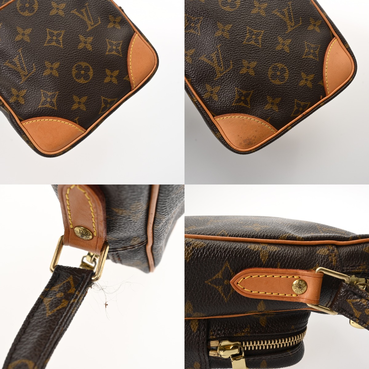 - つぶれ、テカリ、若干べたつき、薄汚れ、ショルダーにクセ、付け根に繊維の出、ヌメ革にヤケやシミ、金具に色ハゲやスリキズなど使用感がございます。