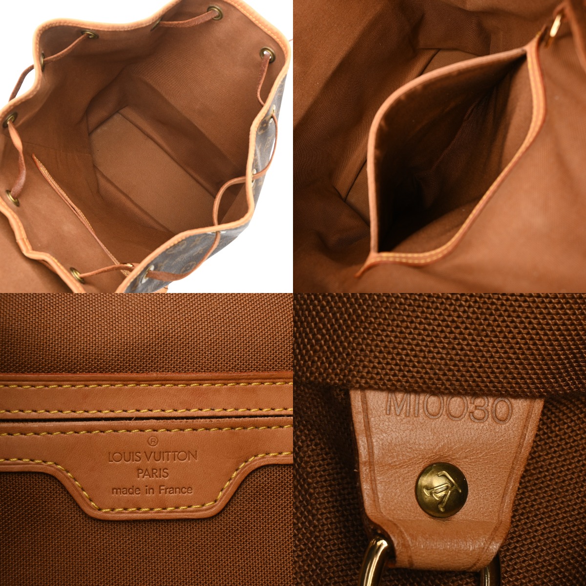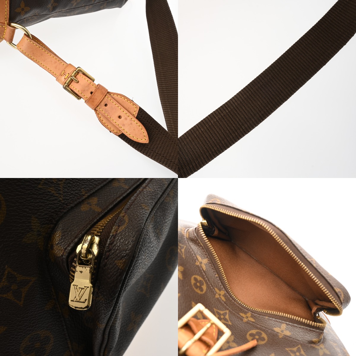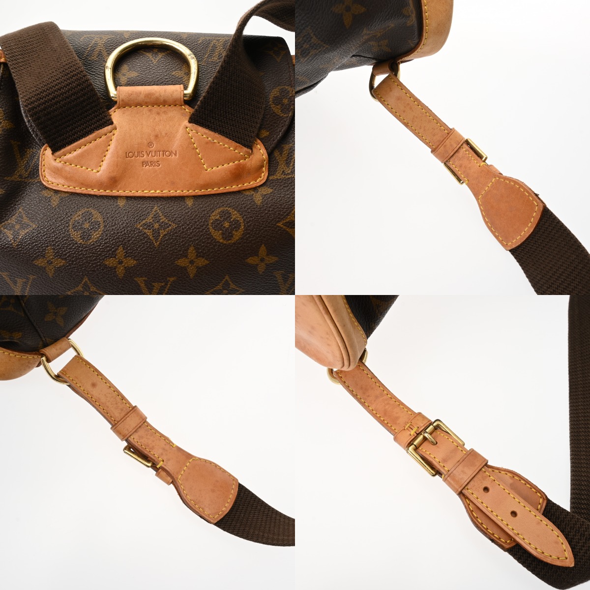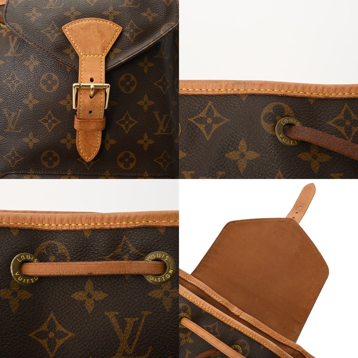 - つぶれ、たたみクセ、テカリ、薄汚れ、シワ、ショルダーや巾着紐にクセ、ヌメ革部分にヤケ、シミ、スレ、コバハゲ、金具に変色、メッキハガレなど使用感がございます。