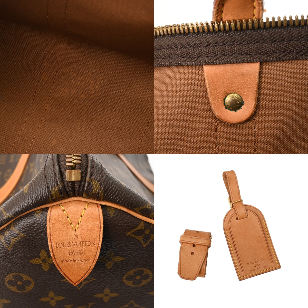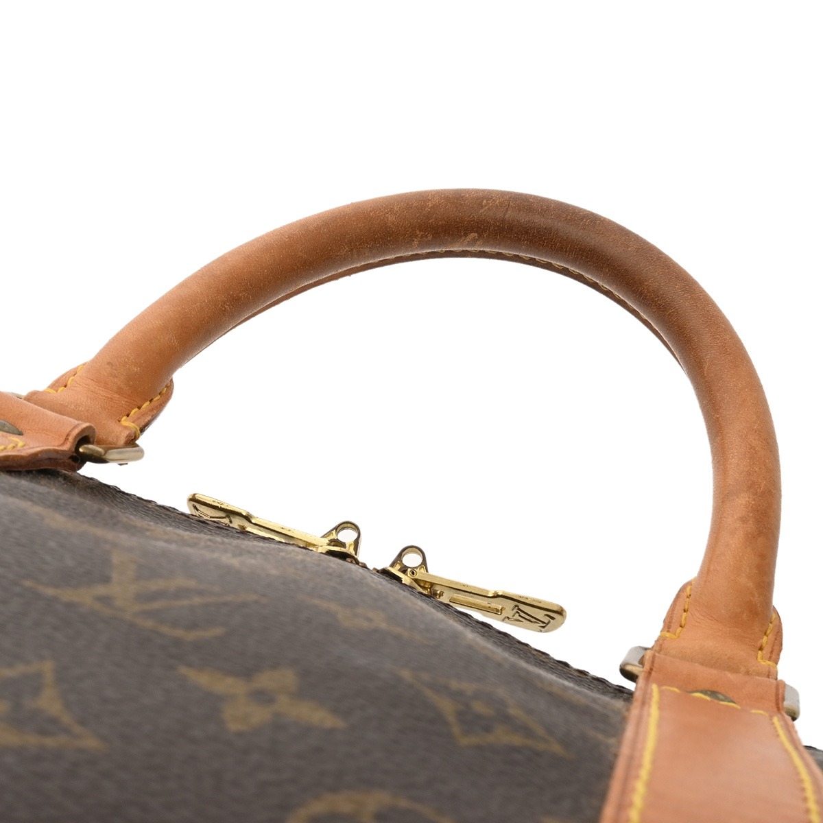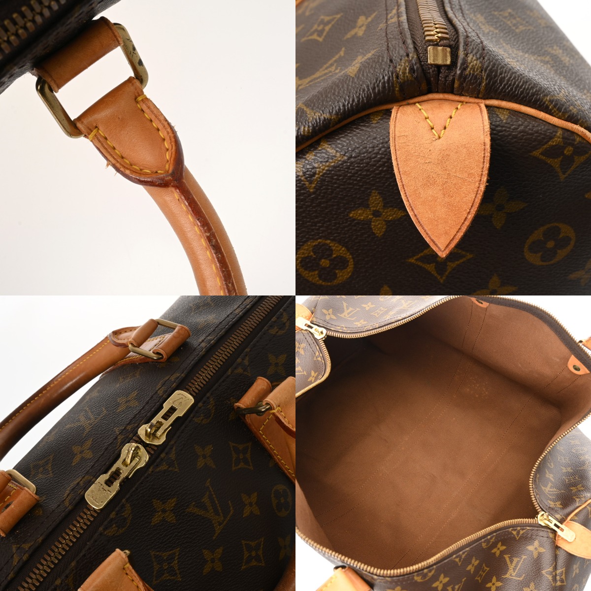 - ベタつき、テカリ、薄汚れ、持ち手含めヌメ革にヤケ、シミ、シワ、コバスレ、金具に変色、色ハゲ、青錆付着など使用感がございます。
