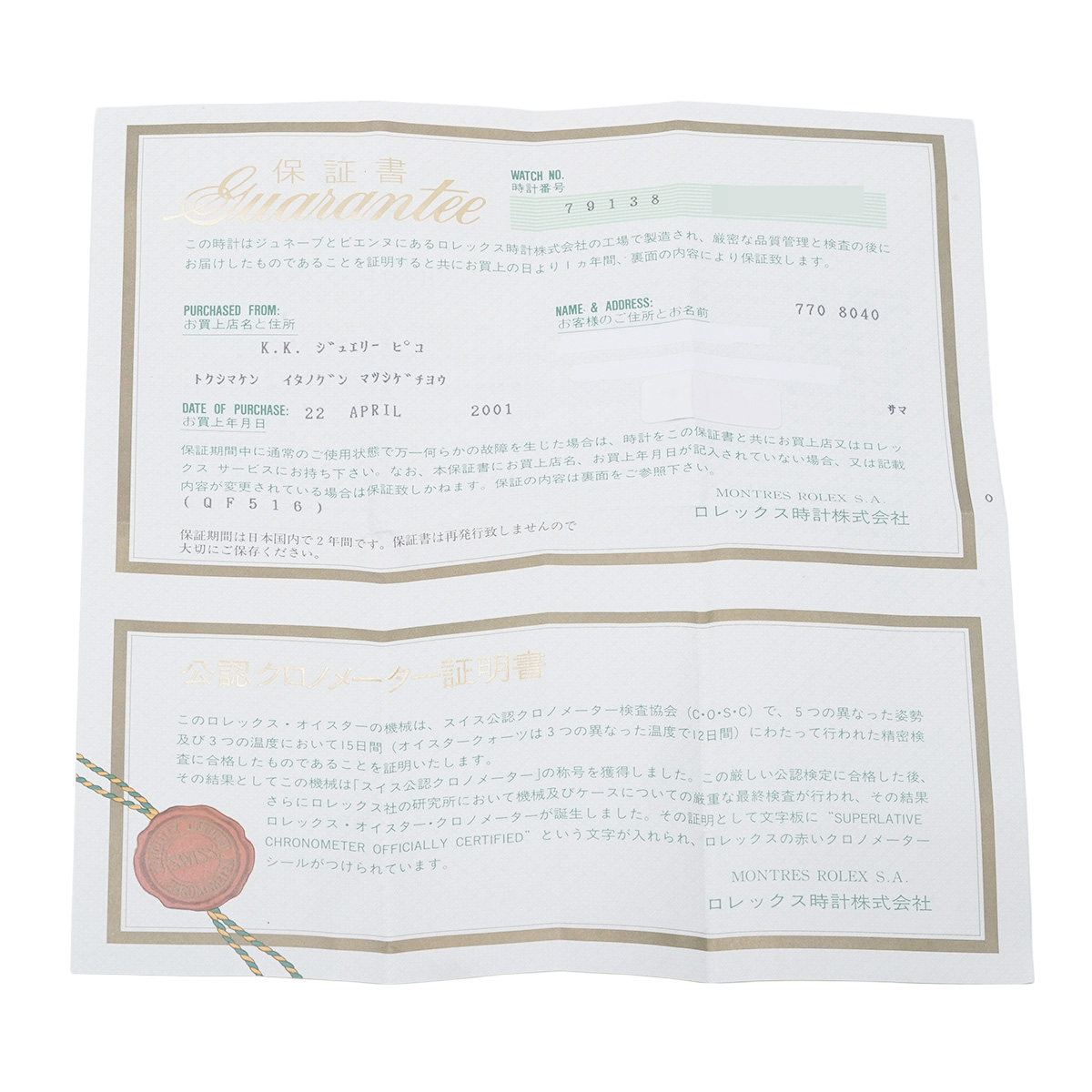 - メーカー保証書( 2001年4月国内購入)