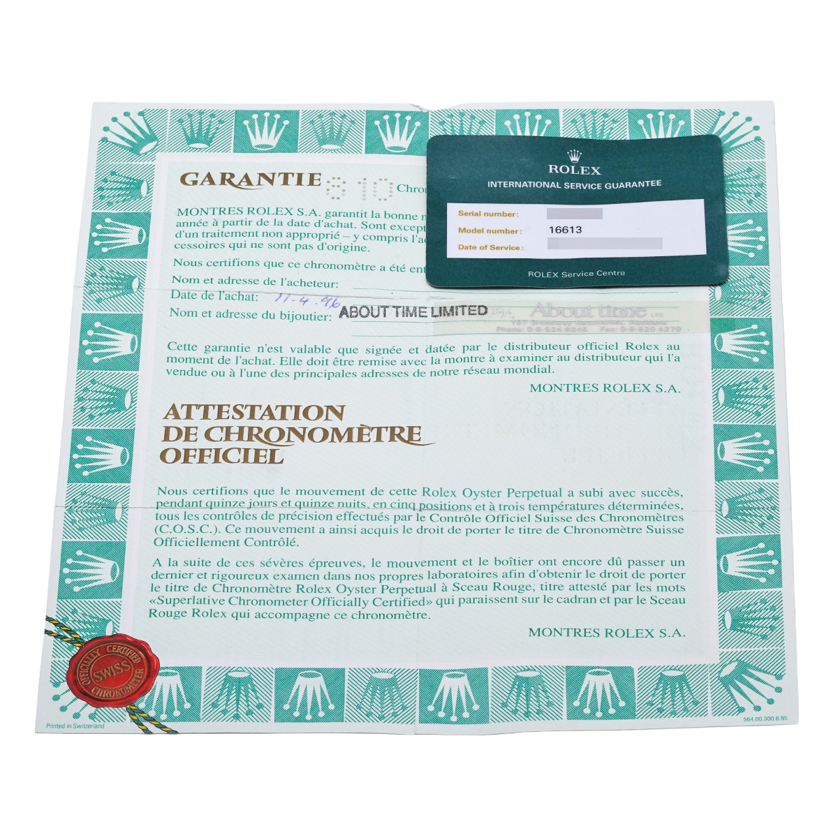 - メーカー保証書( 1996年4月海外購入) / メーカー箱(ダメージ)/冊子/タグ / 国際サービス保証書(2017年3月オーバーホール)
