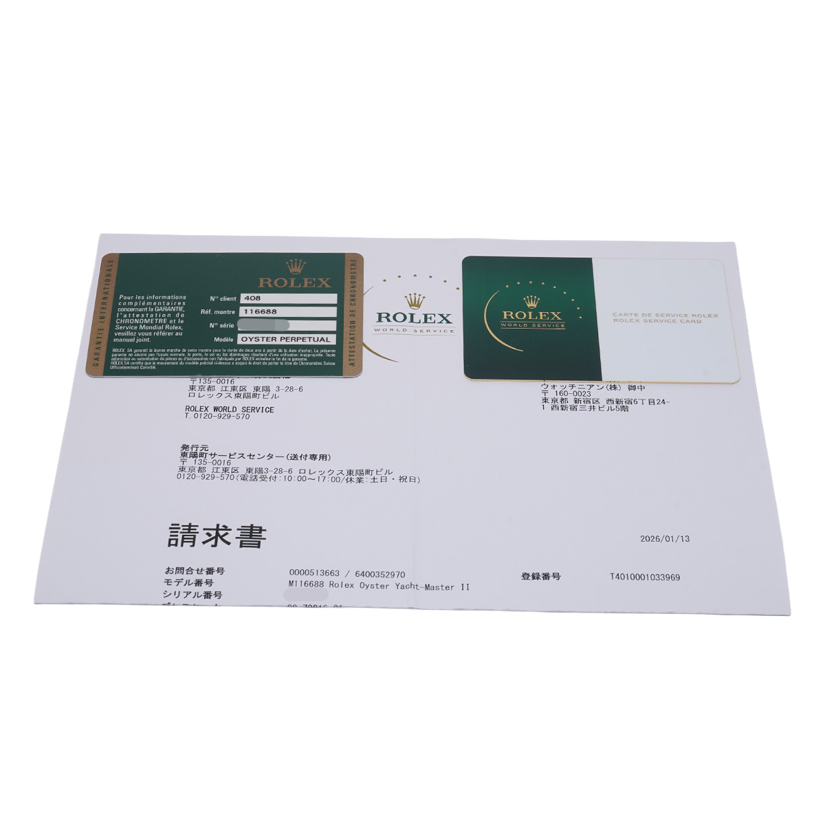 - メーカー保証書( 2008年4月海外購入) / 請求書(2026年1月オーバーホール他)サービスカード(有効期限2028年2月)