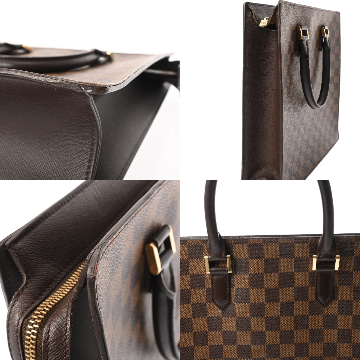 - つぶれ、薄汚れ、スレ、持ち手糸のホツレ、コバに押し跡、ハゲ、ヒビ割れ、金具部分に色ハゲ、スリキズなど使用感がございます。