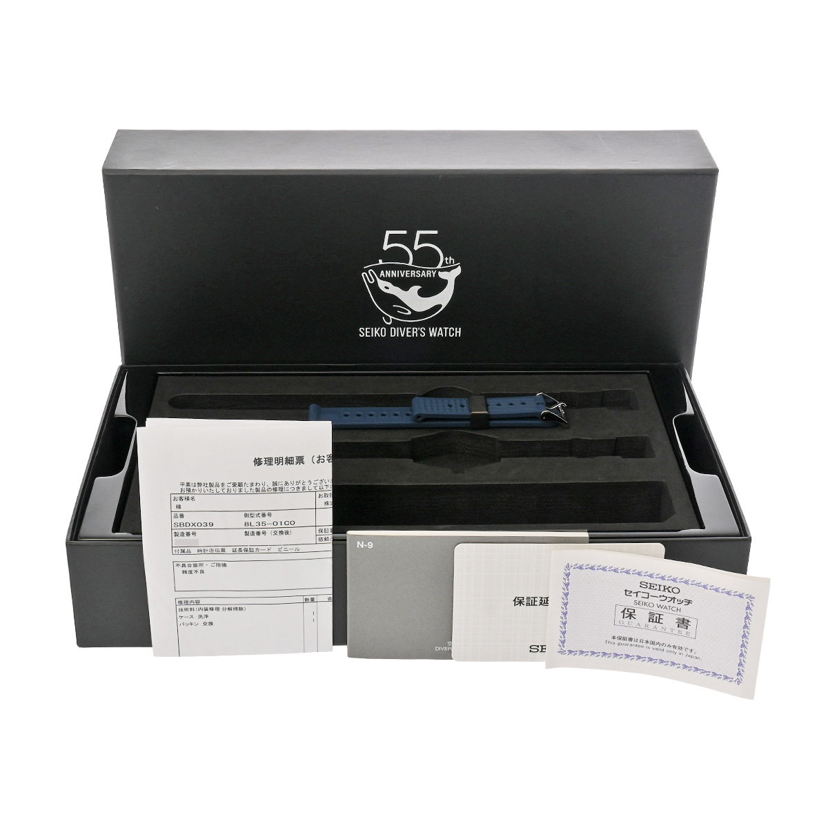 - メーカー保証書( 2022年7月国内購入) / 替えベルト( ラバー/ブルー) / メーカー箱(ダメージ)/冊子 / 修理明細書(2024年3月ケース洗浄他) 保証延長カード