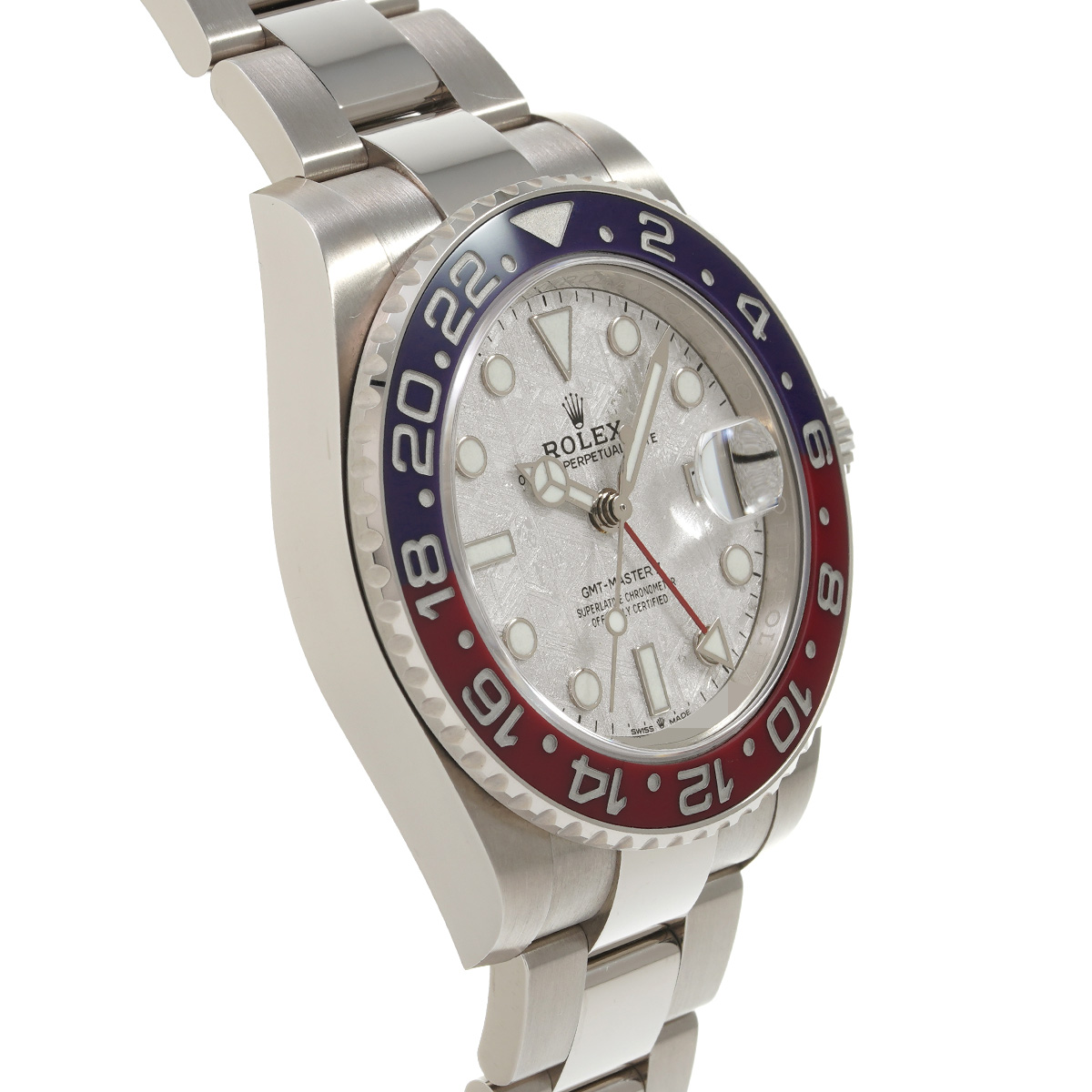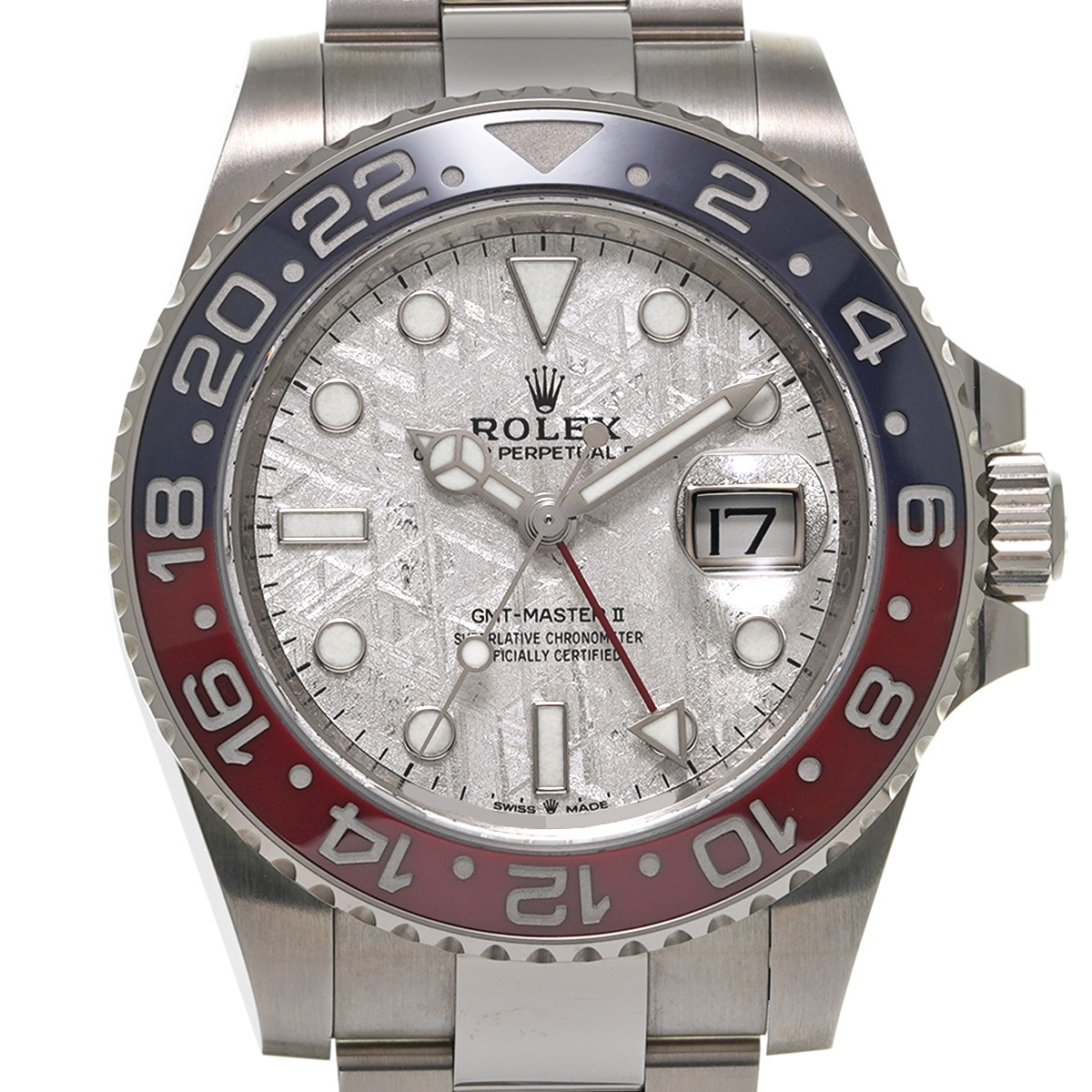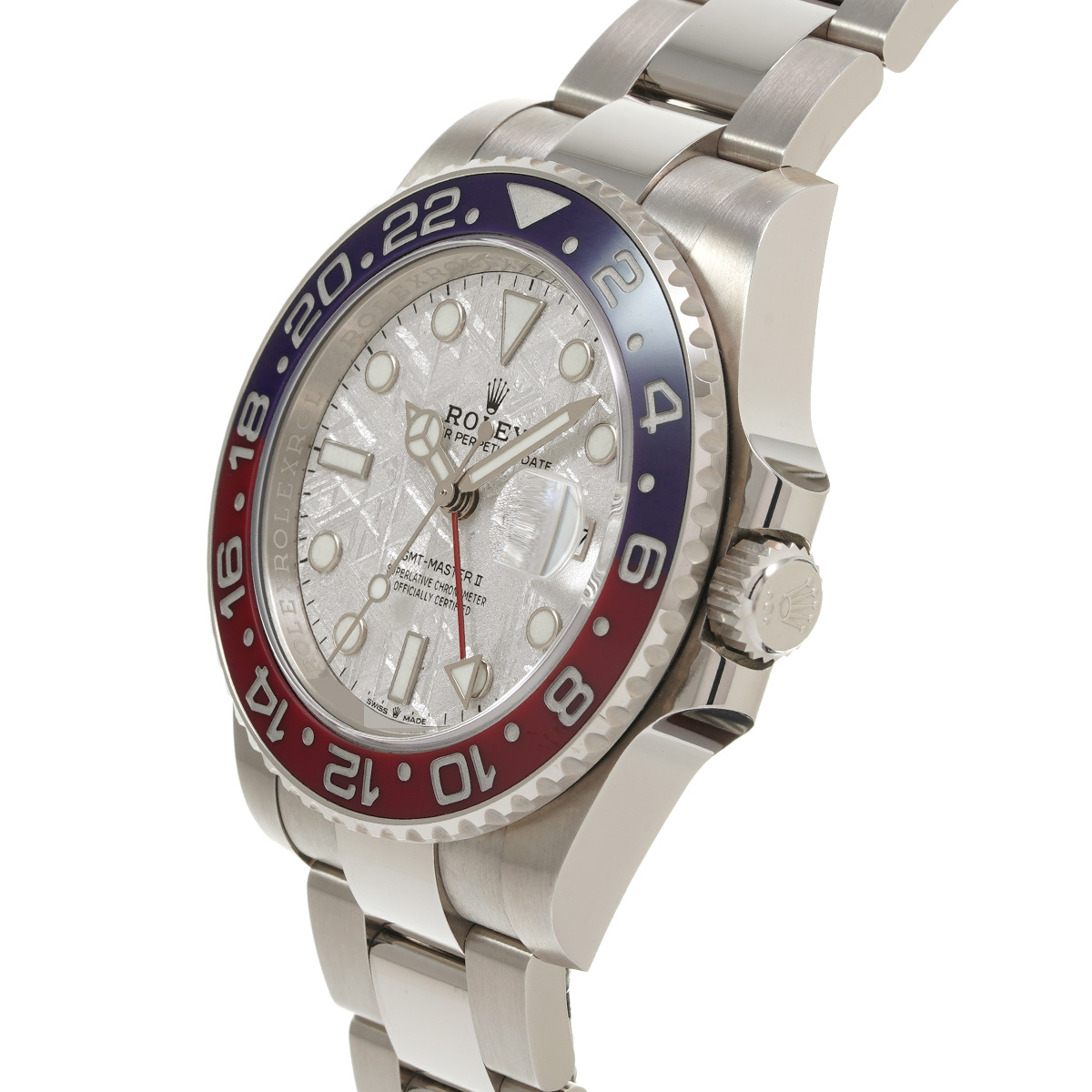ホワイトゴールドのケースとブレスレットに、伝統的な赤と青のツートンのベゼルを備えるGMTマスターIIです。