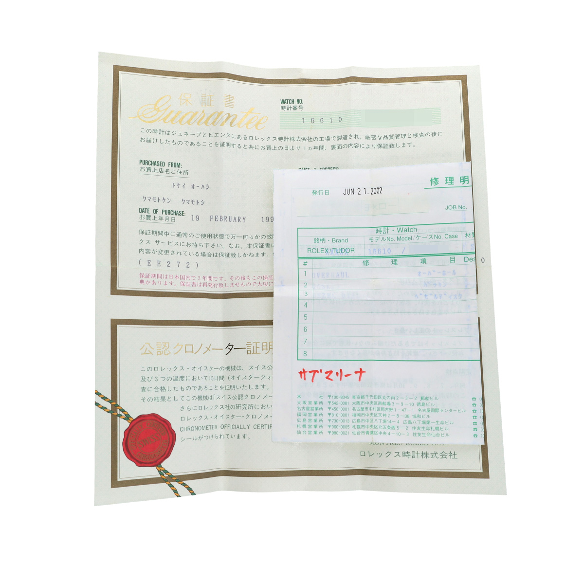 - メーカー保証書( 1995年2月国内購入) / 修理明細書(オーバーホール他)