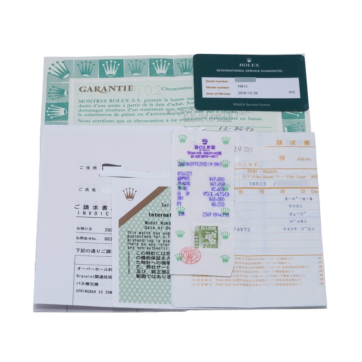 - メーカー保証書( 1992年12月海外購入) / メーカー箱 / 請求書(2001年9月オーバーホール他) ご請求書/納品書(2018年12月オーバーホール他/2008年6月オーバーホール他) 国際サービス保証書(2018年12月オーバーホール/2008年6月オーバーホール)