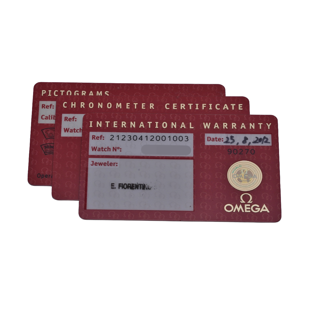 - メーカー保証書( 2012年8月 購入店舗判読不明) / ピクトグラム/クロノメーター証明書
