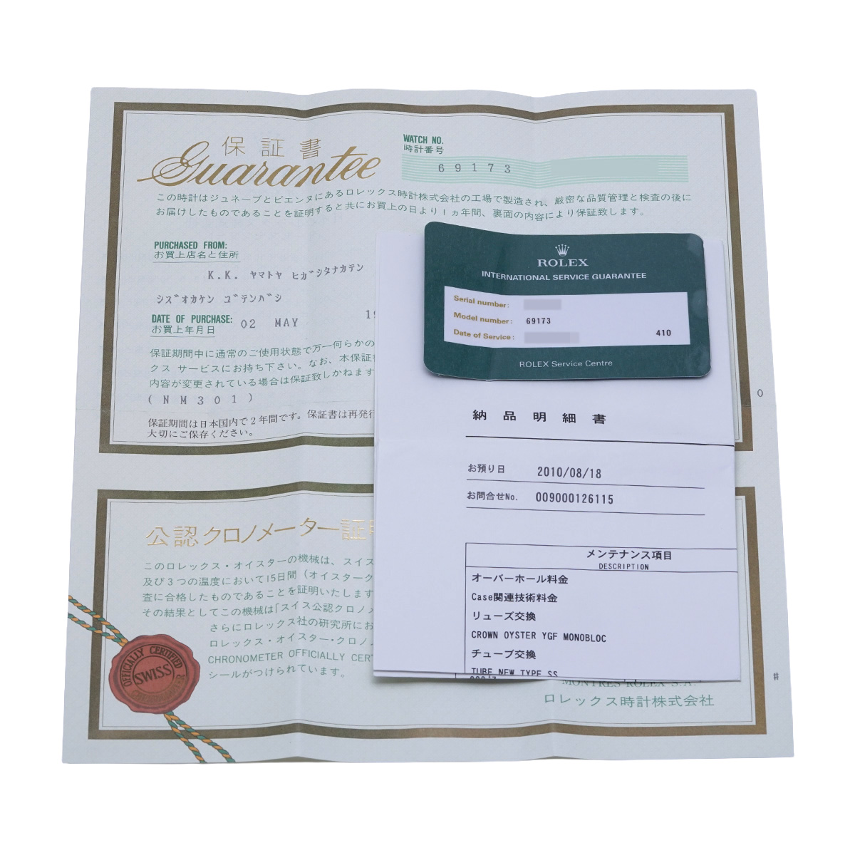 - メーカー保証書( 1999年5月国内購入) / メーカー箱(ダメージ)/冊子 / 納品明細書/国際サービス保証書(2010年9月オーバーホール他)