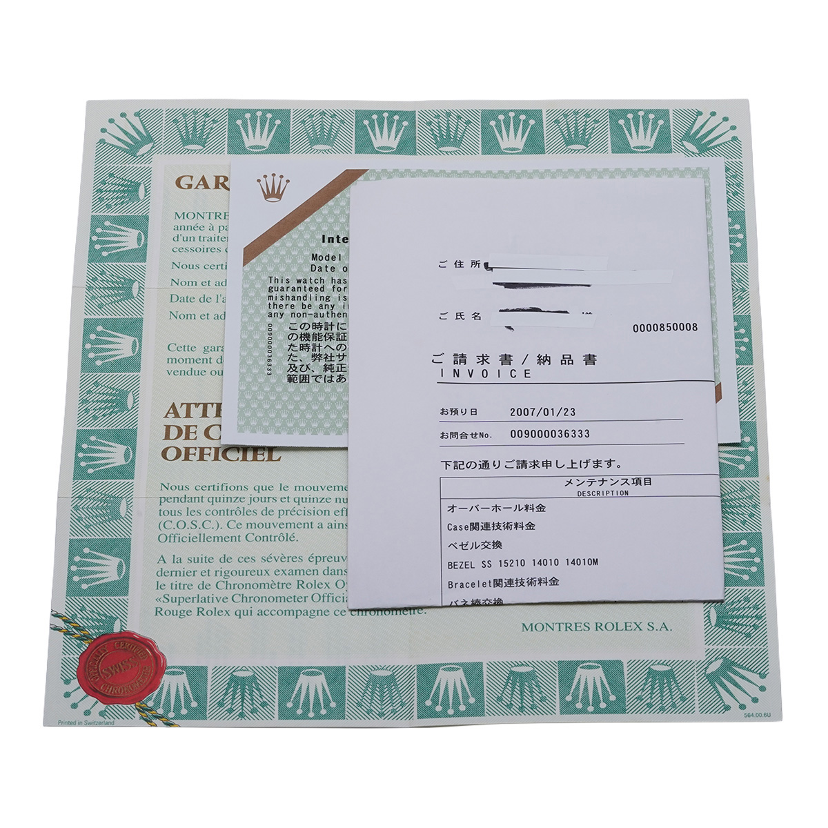 - メーカー保証書( 2000年3月海外購入) / メーカー箱 / ご請求書/納品書(2007年3月オーバーホール他)国際サービス保証書(2007年3月オーバーホール)