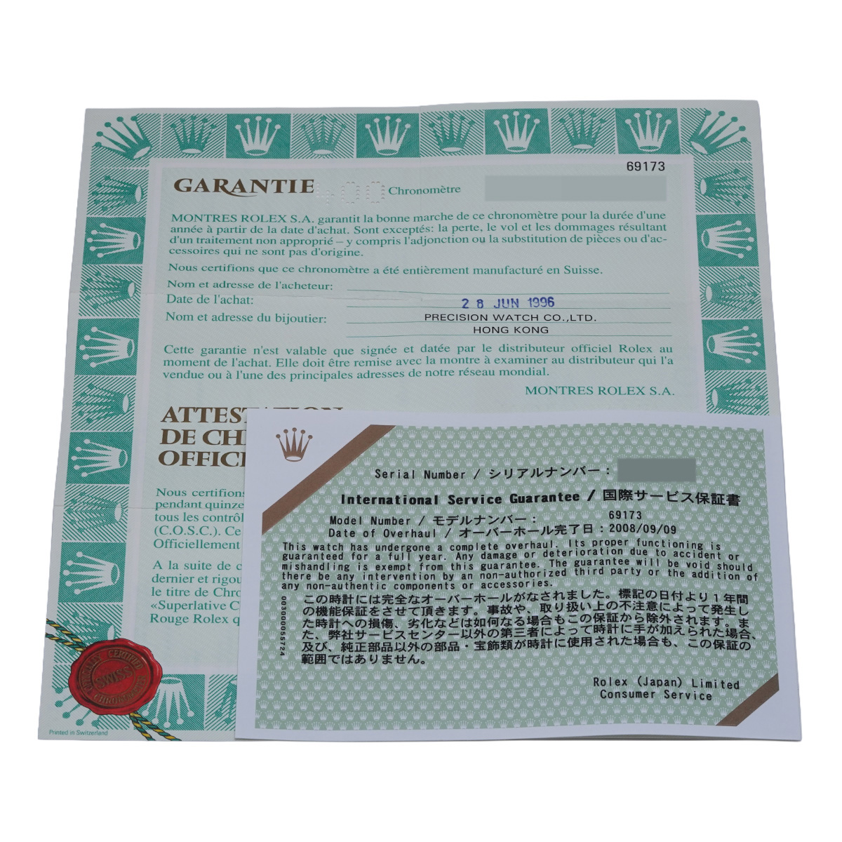 - メーカー保証書( 1996年6月海外購入) / 内箱 / 国際サービス保証書(2008年9月オーバーホール)