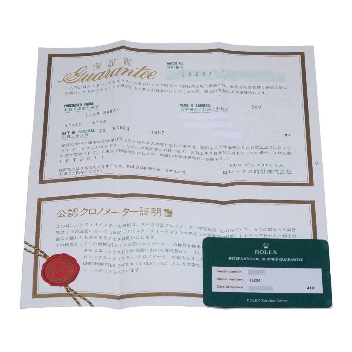 - メーカー保証書( 1997年3月国内購入) / メーカー箱/冊子 / 国際サービス保証書(2015年9月オーバーホール)