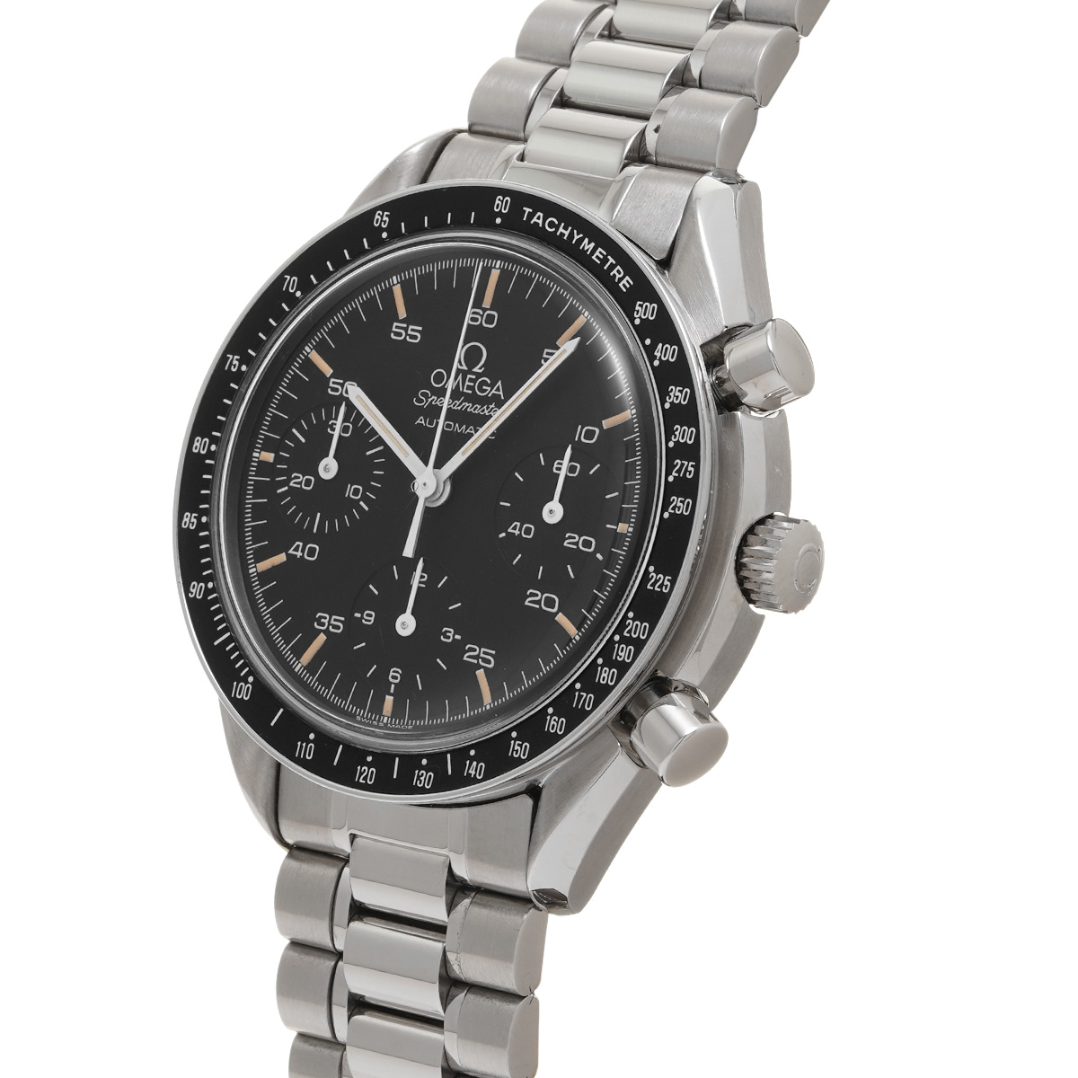 コメントこのスピードマスター リデュースドとも呼ばれるモデルは、オメガの代表的な時計であるスピードマスター プロフェッショナルのツールとして研ぎ澄まされた精悍さはそのままに、ケース径を39ミリに縮小して腕上での収まりを改善すると共に、自動巻きムーブメントの採用によって利便性を向上させることで、より多くの人々の日常に寄り添える時計を目指したものです。