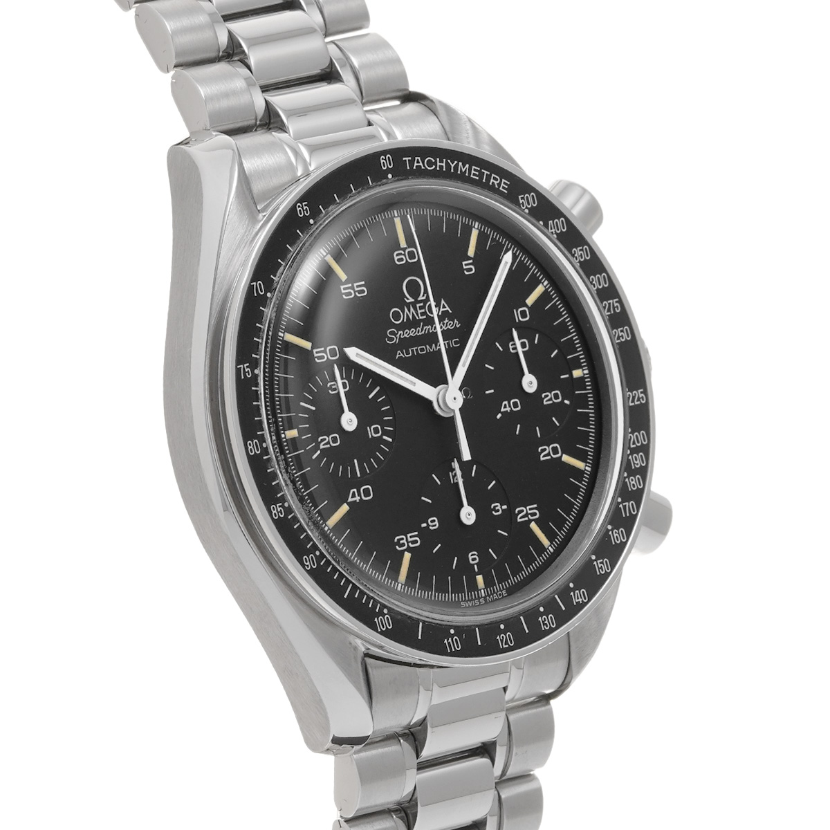 コメントこのスピードマスター リデュースドとも呼ばれるモデルは、オメガの代表的な時計であるスピードマスター プロフェッショナルのツールとして研ぎ澄まされた精悍さはそのままに、ケース径を39ミリに縮小して腕上での収まりを改善すると共に、自動巻きムーブメントの採用によって利便性を向上させることで、より多くの人々の日常に寄り添える時計を目指したものです。