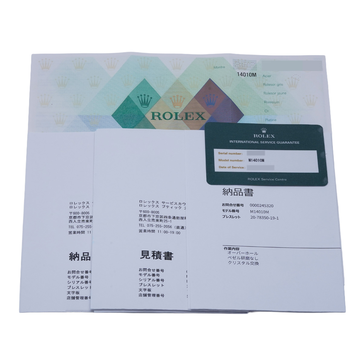 - メーカー保証書( 2005年9月海外購入) / メーカー箱(ダメージ) / 納品書/国際サービス保証書(2022年12月オーバーホール他) 納品書明細書(2025年10月文字板・針交換)