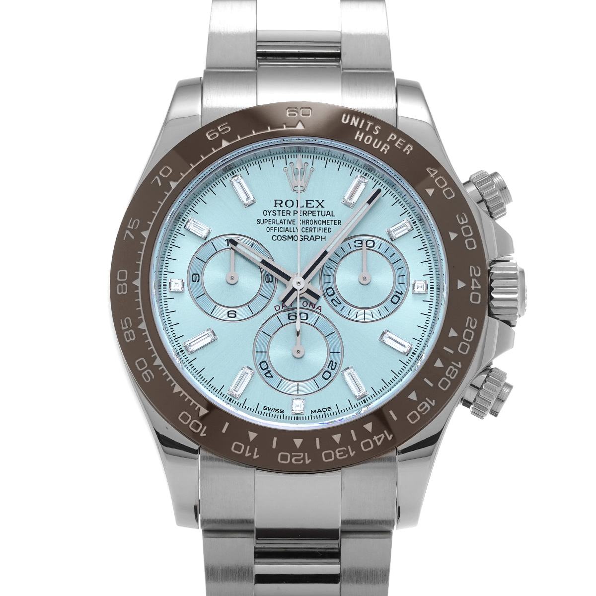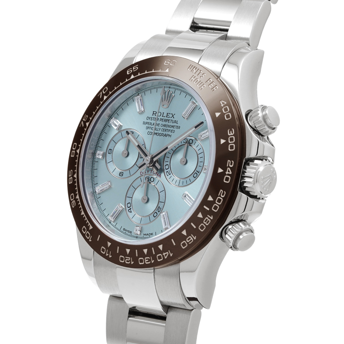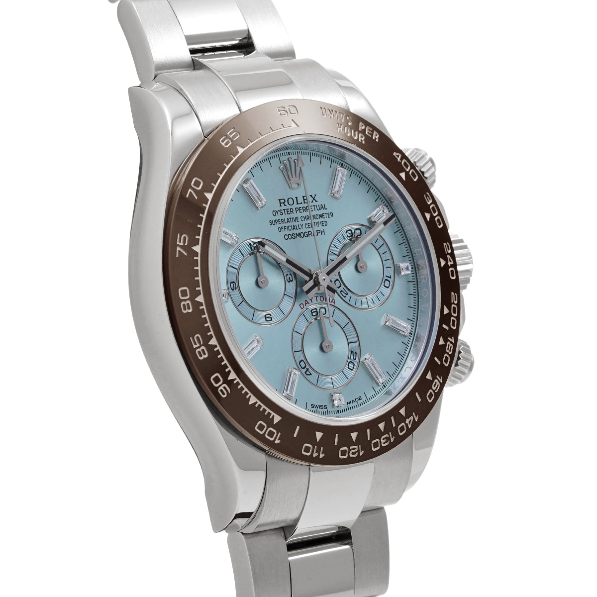 プラチナモデルのみに使用が許されるアイスブルーの文字盤と、チェストナットブラウンのセラクロムベゼル、そしてプラチナモデルならではの圧倒的な存在感は、これを手にする人に鮮烈な印象を与えます。