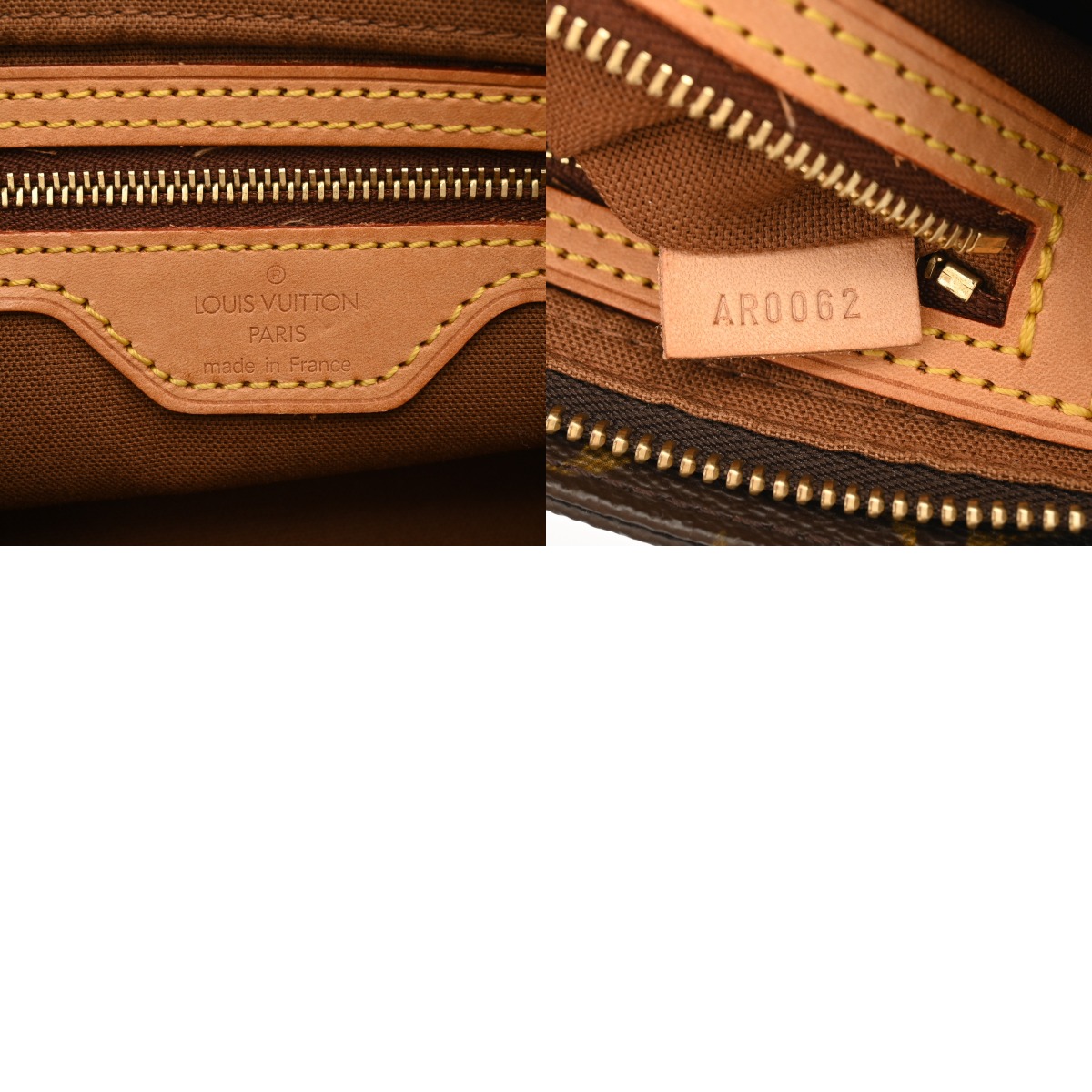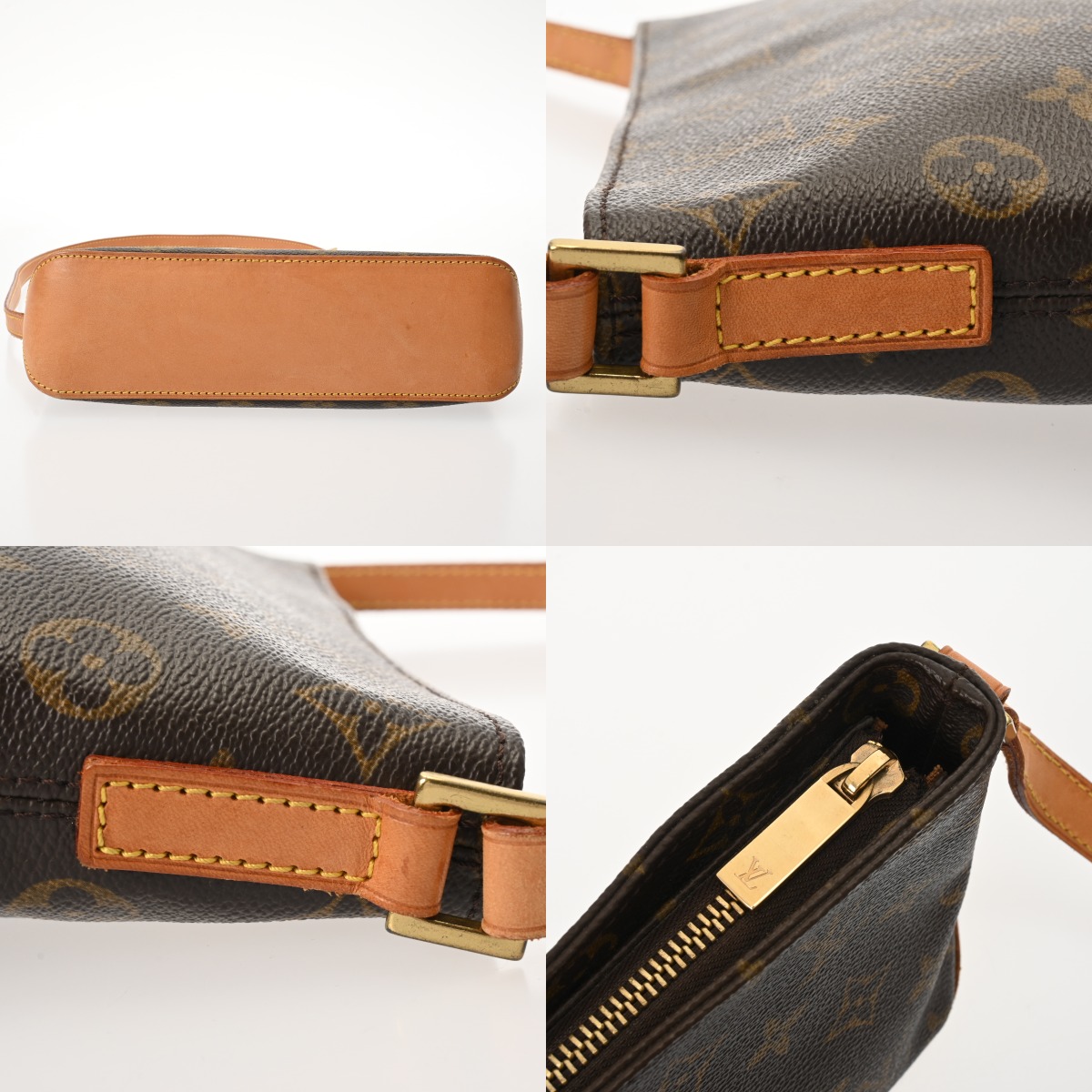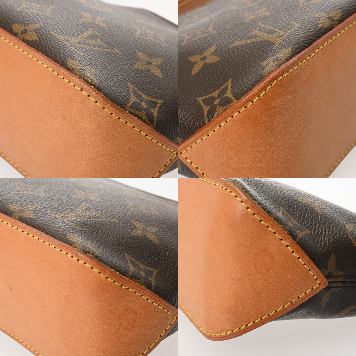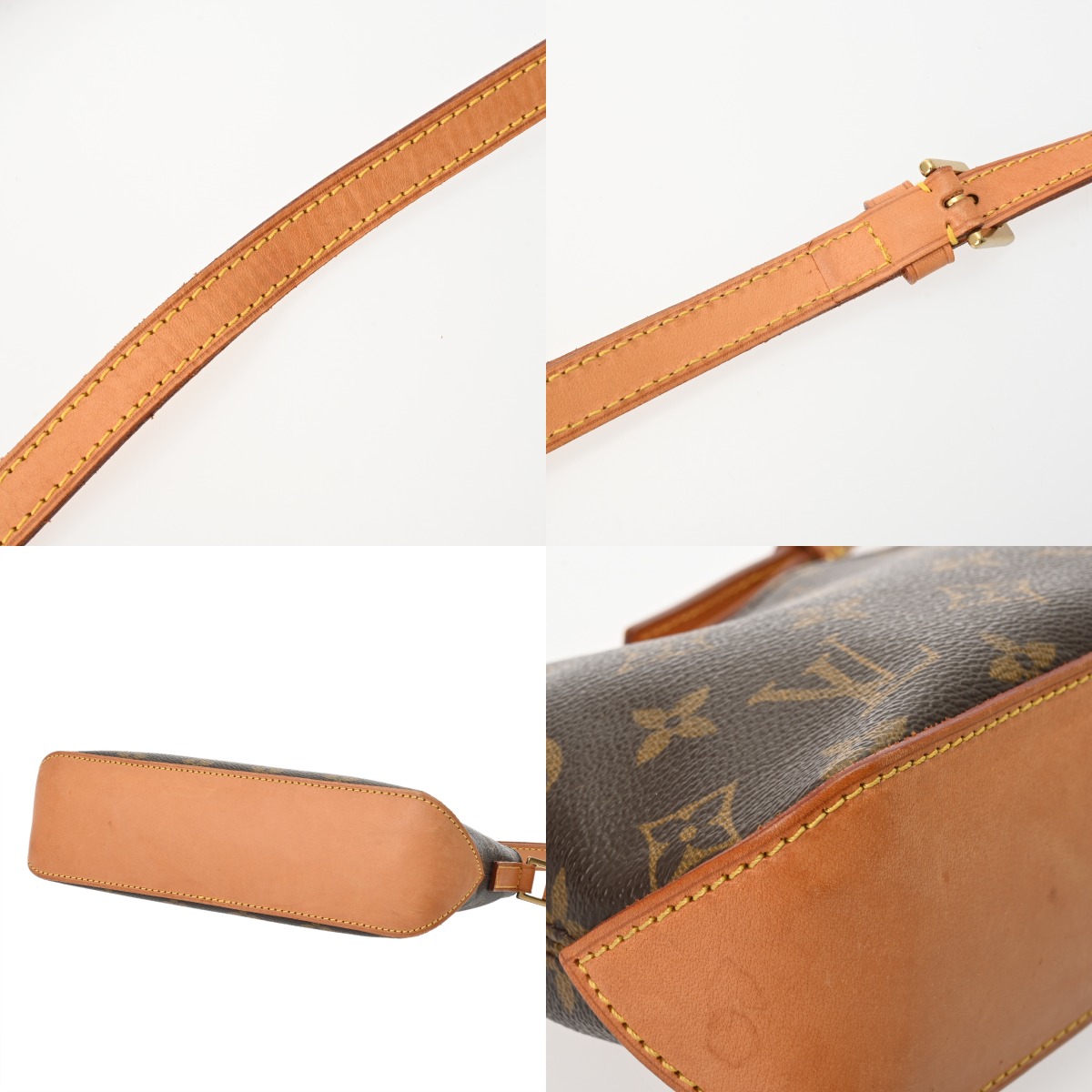 - つぶれ、テカリ、薄汚れ、バッグ口に少しヨレ、ヌメ革部分にスレなど使用感、金具部分にスリキズなど少し使用感がございます。