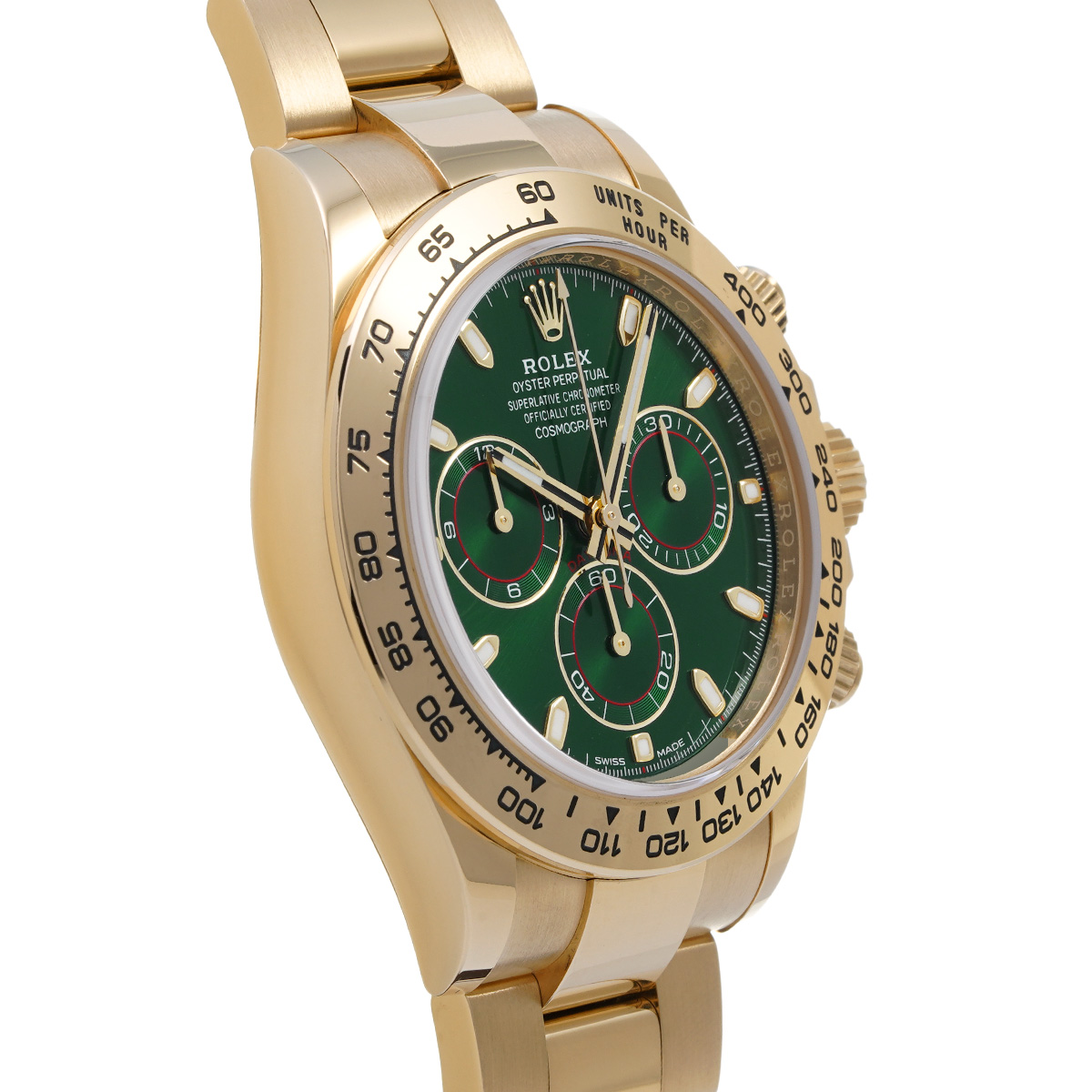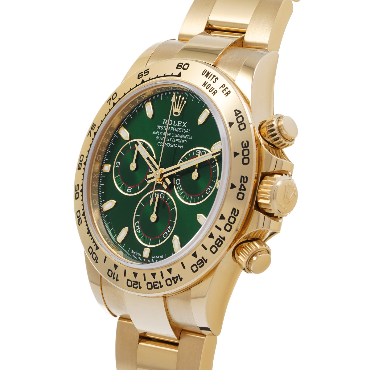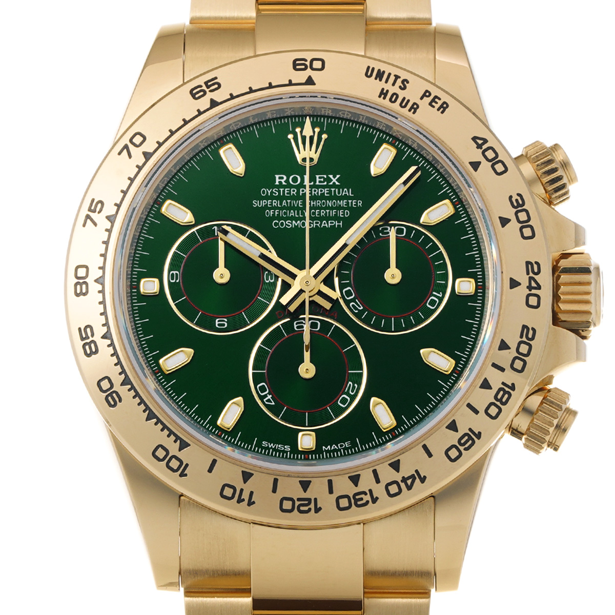 アメリカのギタリスト、ジョン・メイヤーが「究極のデイトナ」として紹介したことで人気が高まったといわれる、グリーンダイアルのイエローゴールドモデルです。