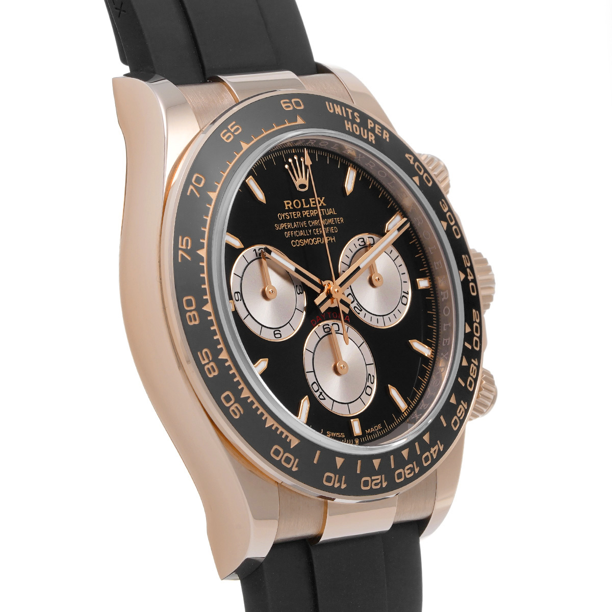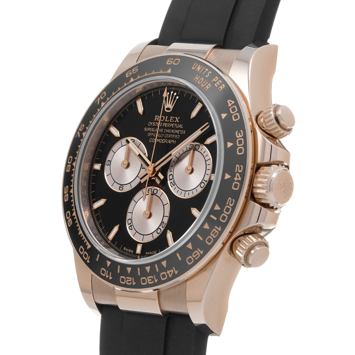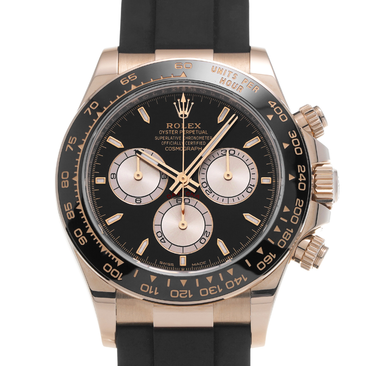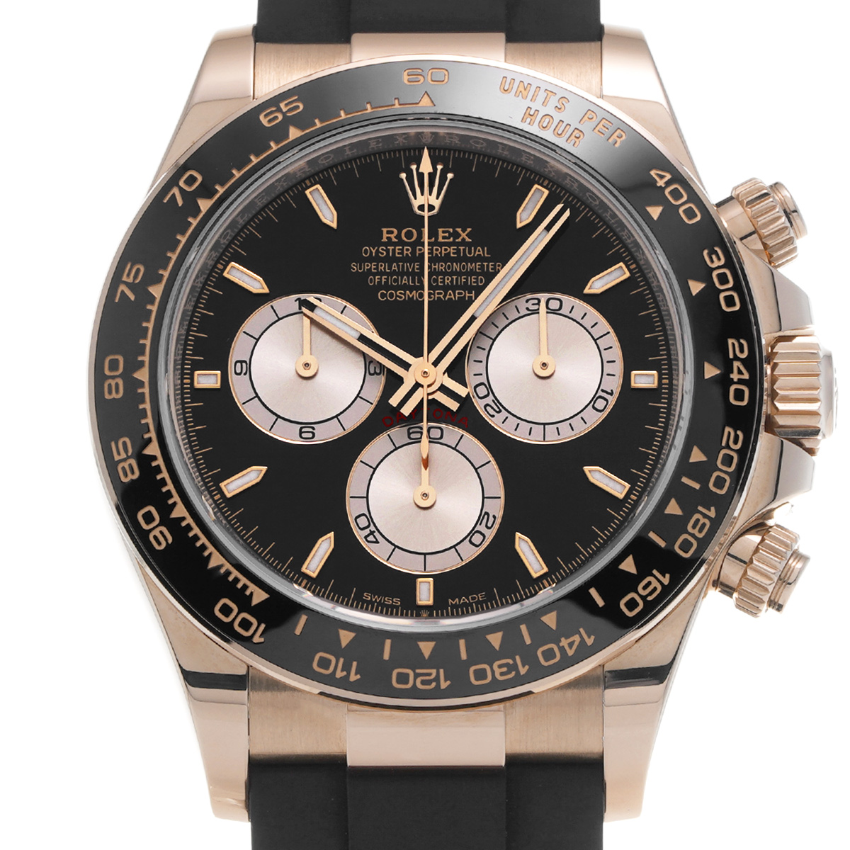 コメントコスモグラフ デイトナの、エバーローズゴールドケースにオイスターフレックスブレスレットやセラクロムベゼルを採用したスポーティーなバリエーションです。