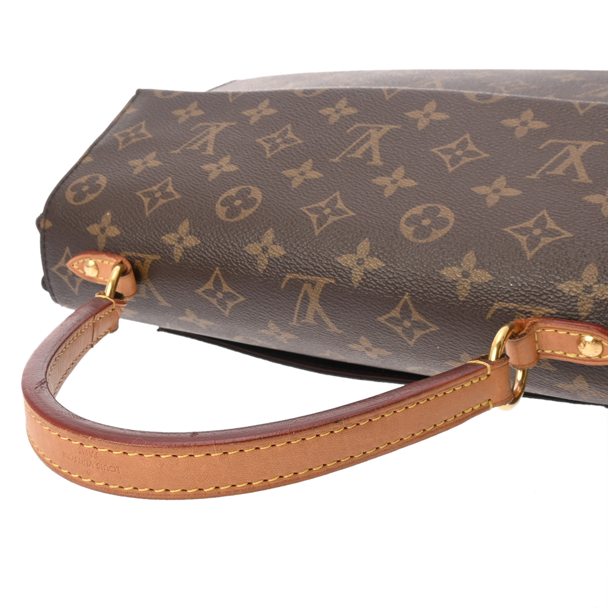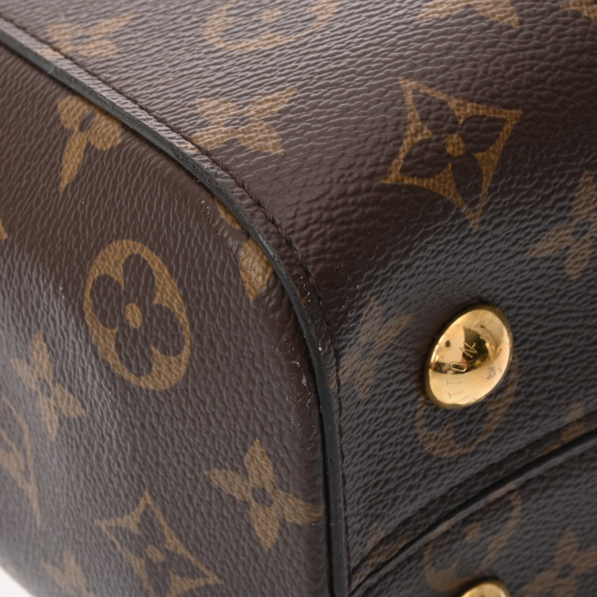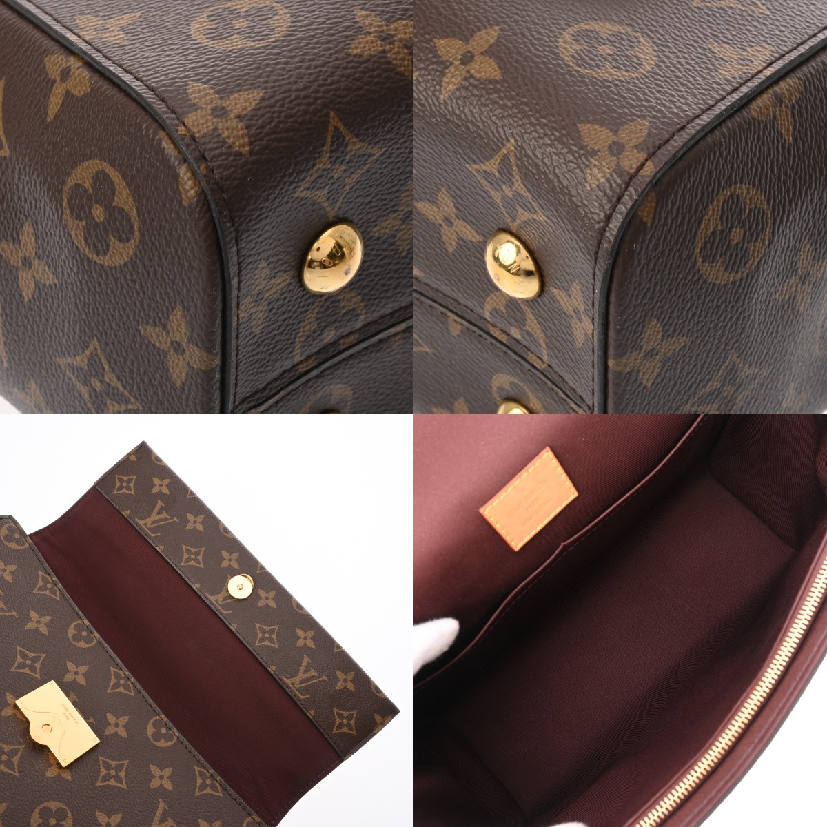 - 薄汚れ、持ち手コバスレ、外ポケットに広がり、付属品含めヌメ革部分にヤケやシワなど使用感、金具部分にスリキズなど使用感がございます。