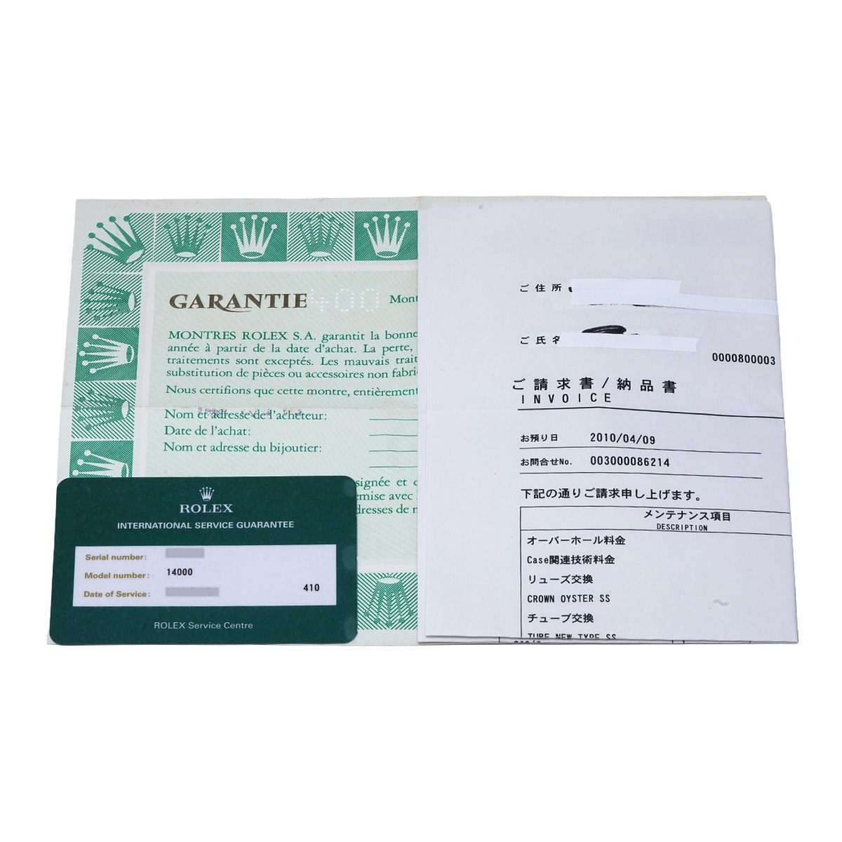 - メーカー保証書( 1991年10月海外購入) / メーカー箱(ダメージ) / ご請求書/納品書、国際サービス保証書(2010年5月オーバーホール他)