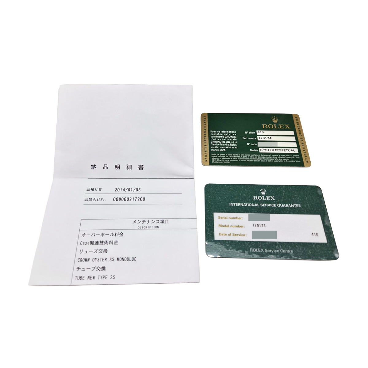 - メーカー保証書( 2010年1月海外購入) / メーカー箱/冊子/タグ / 国際サービス保証書(2014年2月オーバーホール) 修理明細書(2014年2月リューズ交換他)
