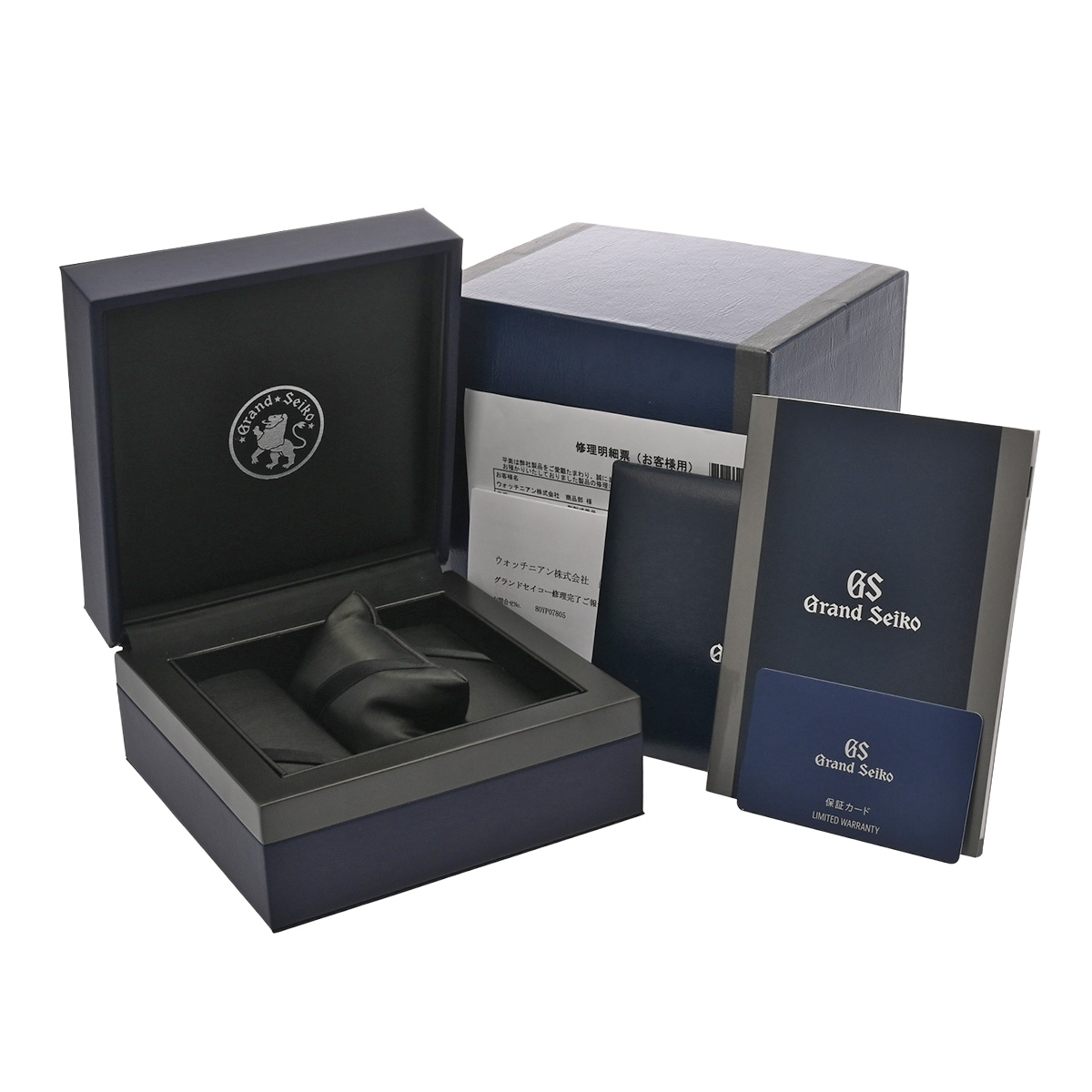 - メーカー保証書( 2021年10月国内購入) / メーカー箱(ダメージ)/冊子/GS規格書 / グランドセイコー修理完了後報告書/修理明細票(2026年2月バンド交換他)