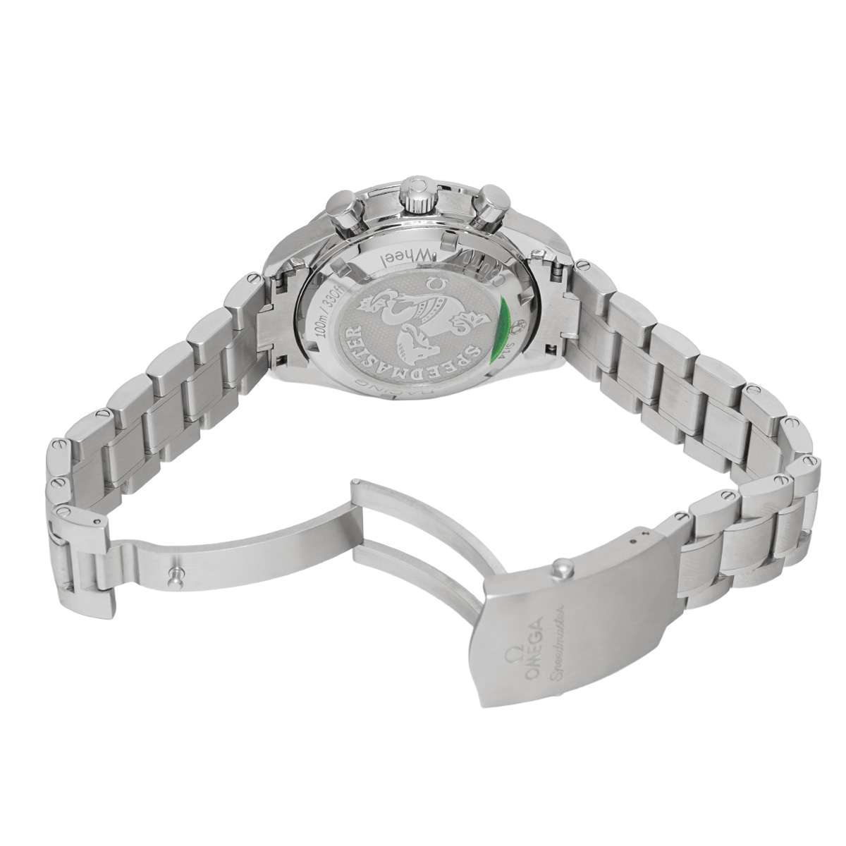 コメントケースを小径化して腕上での収まりの良さを改善すると共に、デイト表示付きの自動巻きムーブメントや100m防水などで、より日常使用に向くモデルとして仕立てた自動巻きのスピードマスターは、歴代モデルのすべてが大変に人気の高いものになっていますが、こちらは2012年にコーアクシャル脱進機とコラムホイール式のクロノグラフ機構を搭載して大幅にグレードアップしたレーシングです。