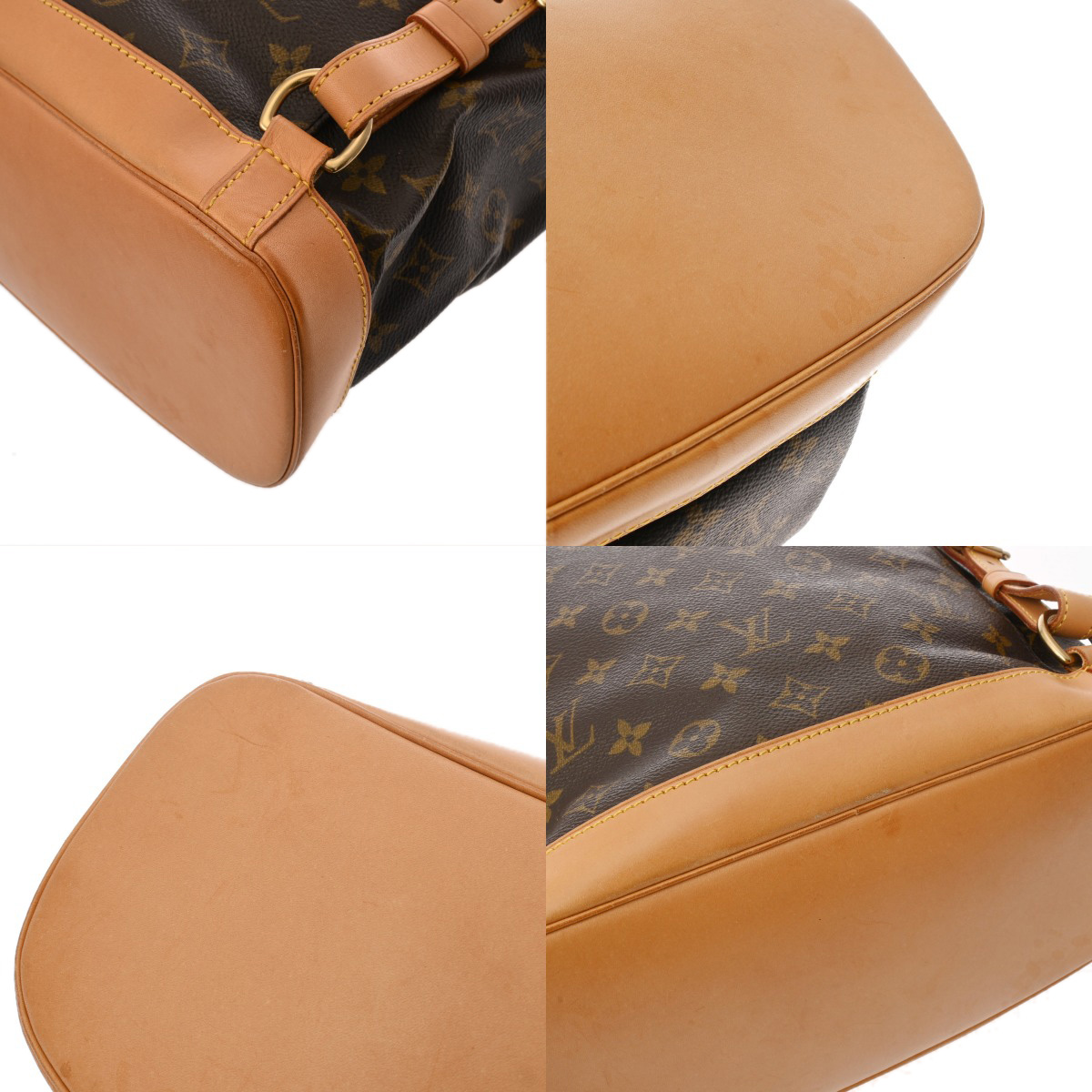 - つぶれ、たたみクセ、テカリ、薄汚れ、シワ、ショルダーにクセ、ヌメ革部分にヤケ、シミ、金具に色ハゲやスリキズなど少々使用感がございます。