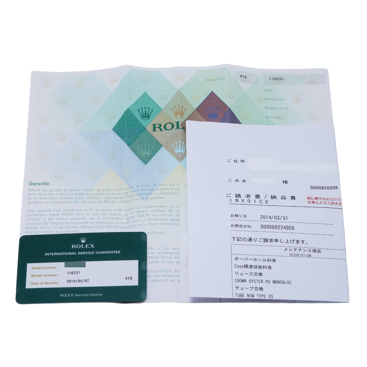 - メーカー保証書( 2006年10月国内購入) / メーカー箱/冊子 / ご請求書/納品書(2014年5月オーバーホール他)国際サービス保証書(2014年5月オーバーホール)