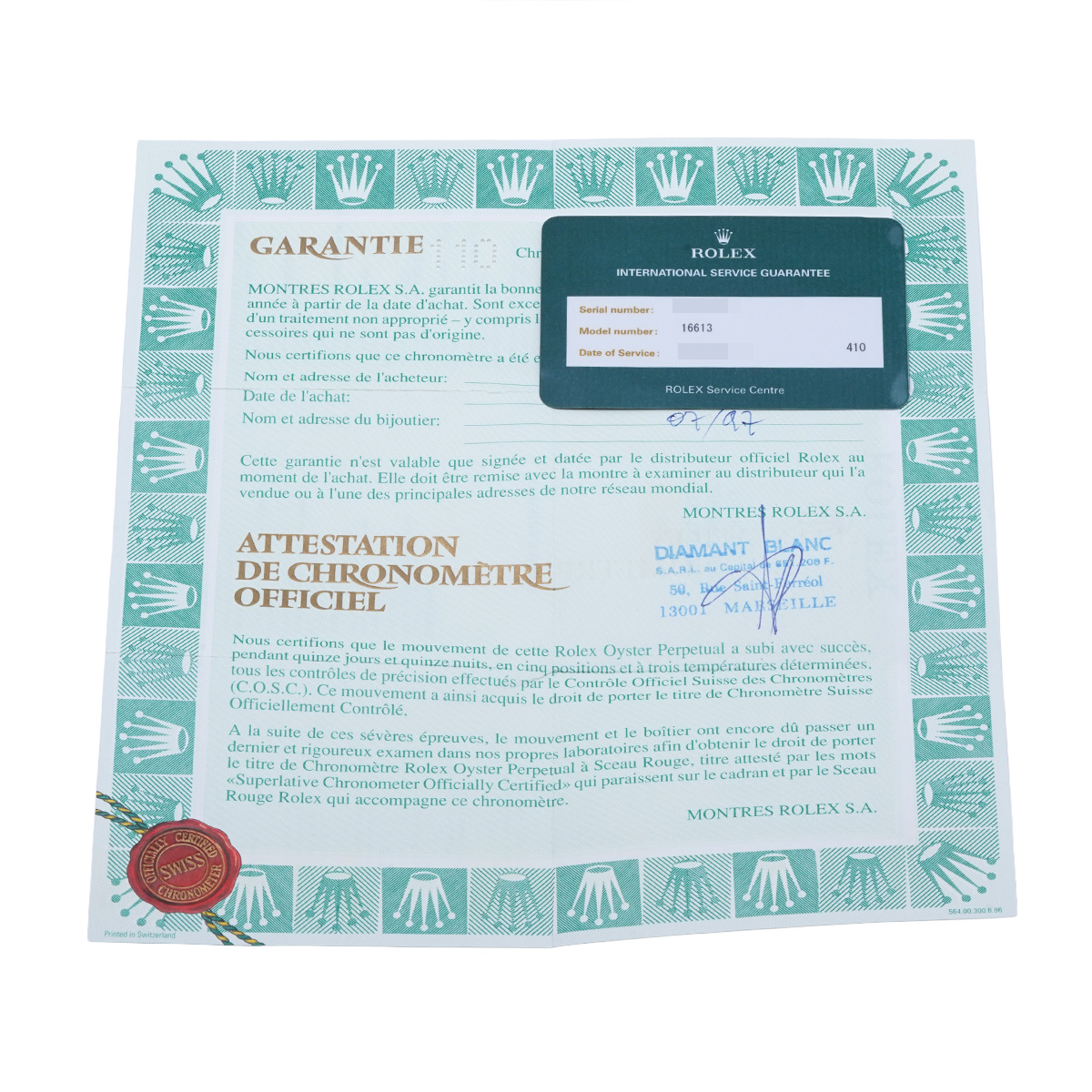 - メーカー保証書( 1997年7月海外購入) / メーカー箱(ダメージ)/冊子 / 国際サービス保証書(2018年6月オーバーホール)