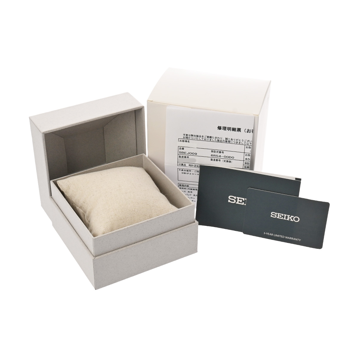 - メーカー保証書( 2025年10月国内購入) / メーカー箱(ダメージ)/冊子 / 修理明細書(2025年10月内装修理/ムーブ交換)