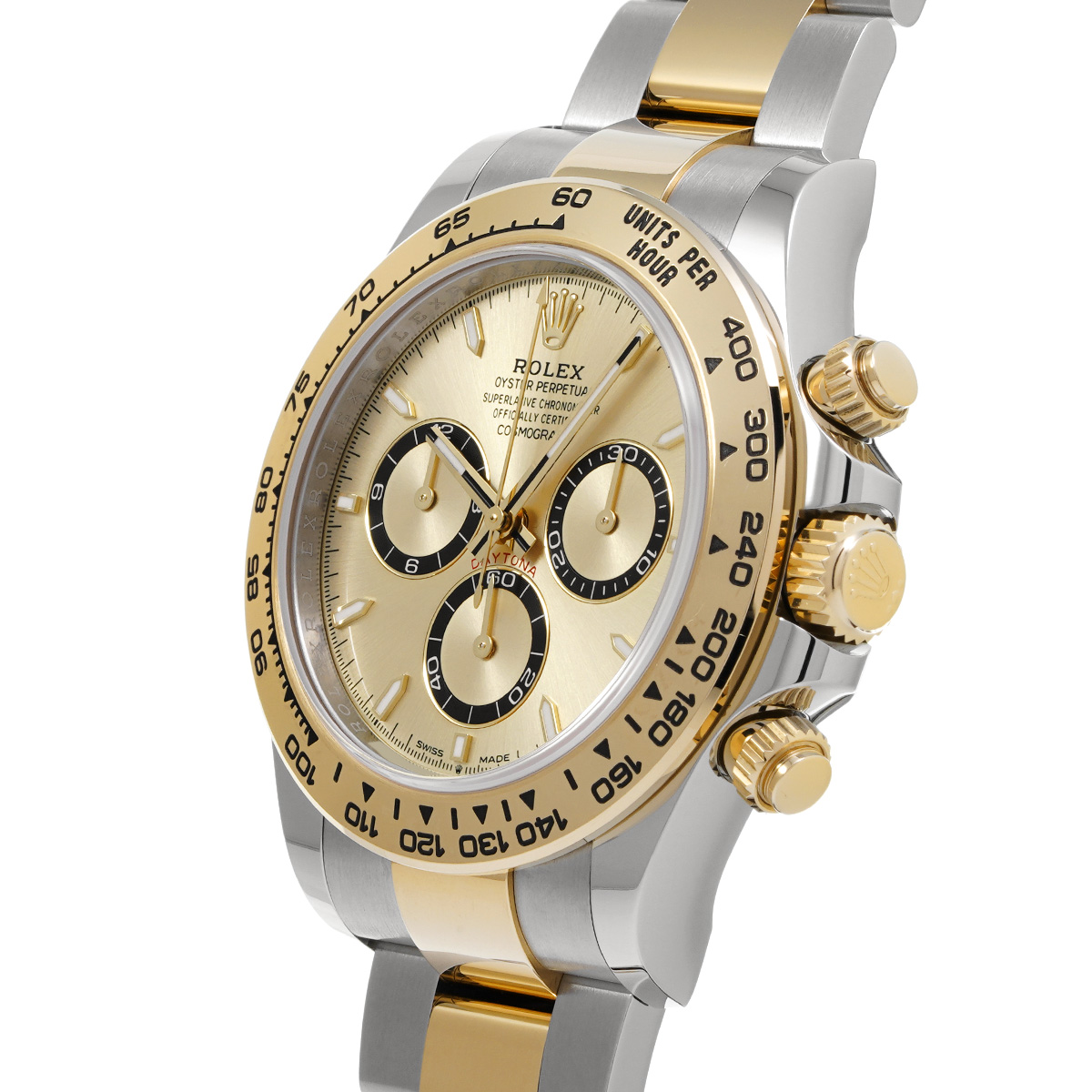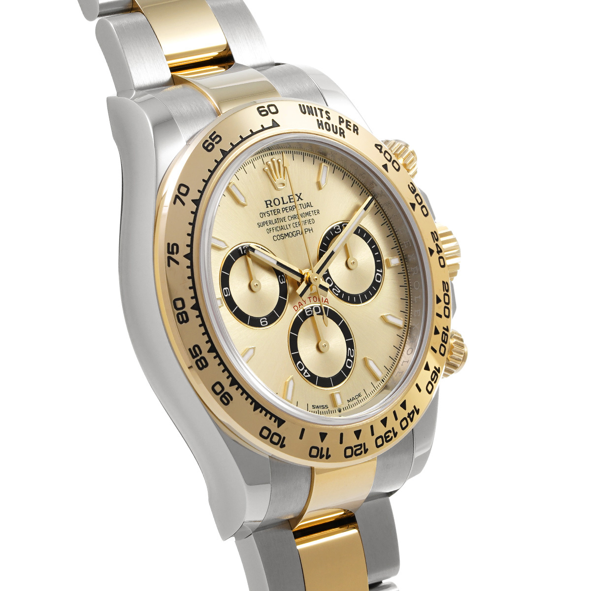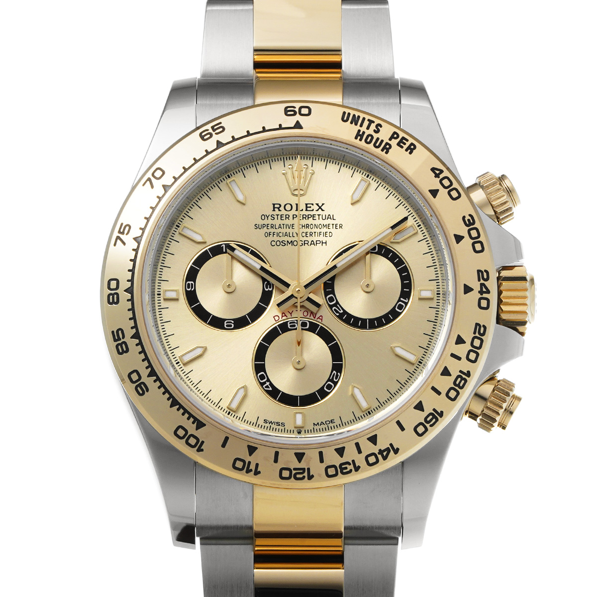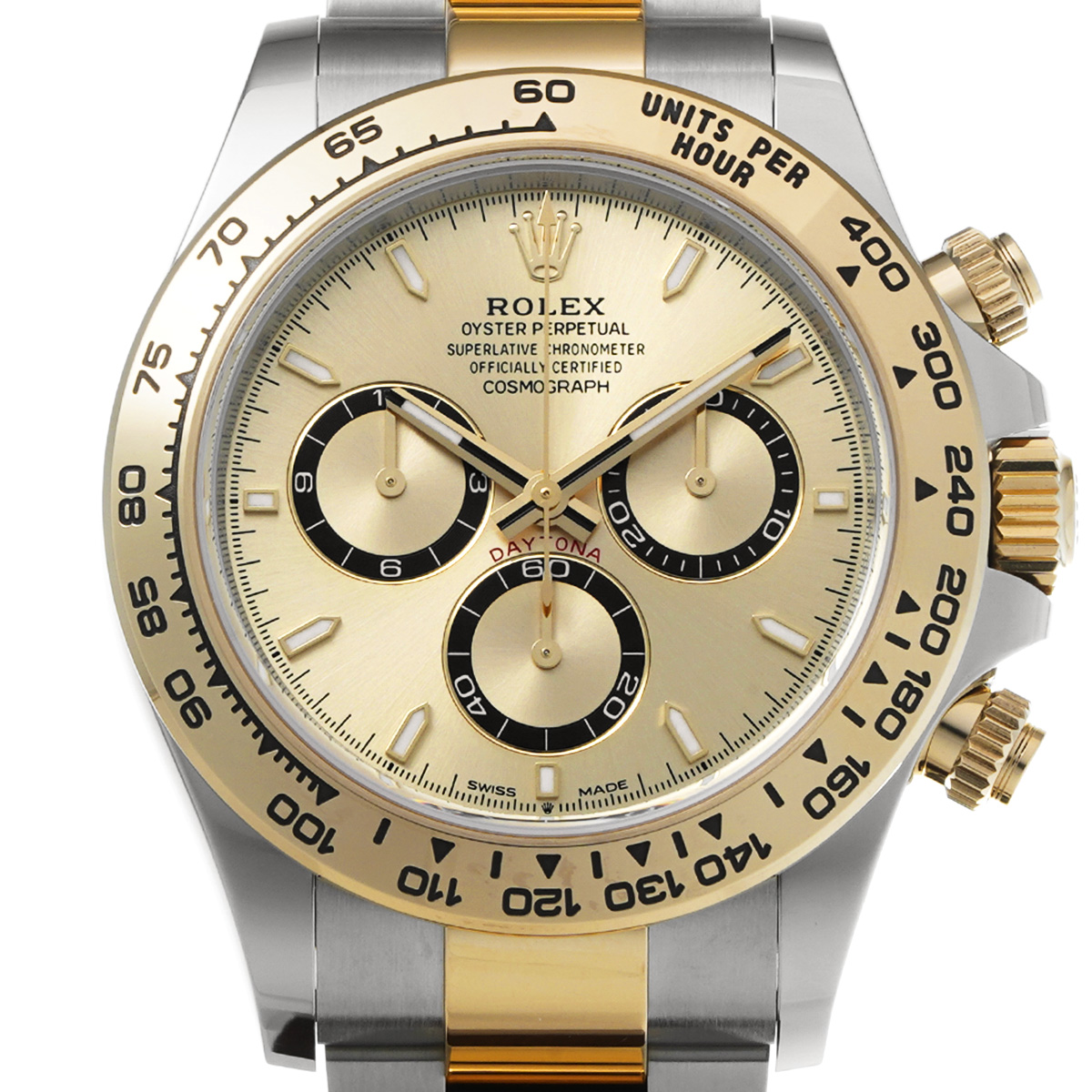 コメント現代最高の機械式クロノグラフのひとつ、コスモグラフ デイトナの、スチールとイエローゴールドのコンビ(=イエローロレゾール)の外装を持つモデルです。