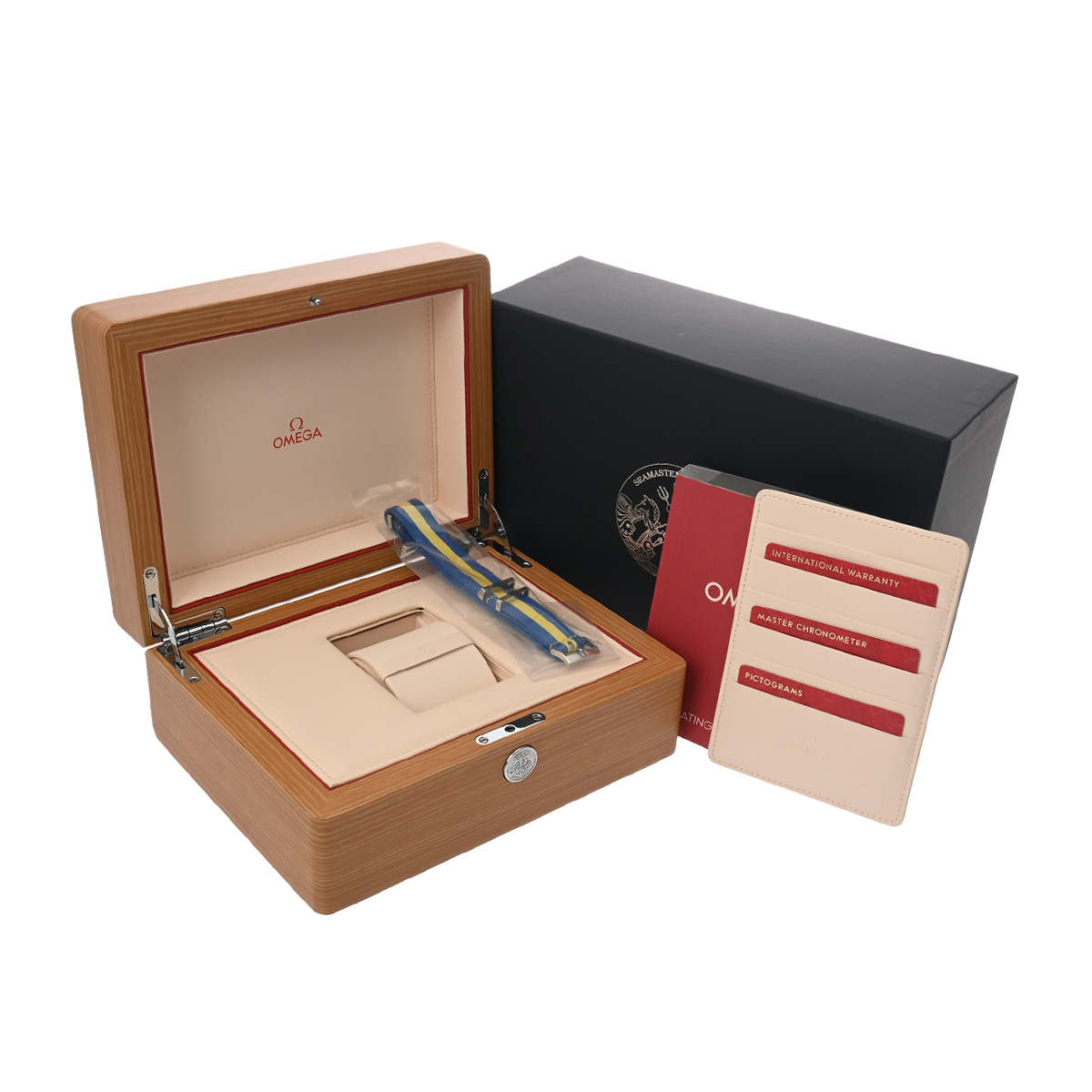 - メーカー保証書( 2025年9月国内購入) / 替えベルト( ナイロン/ブルー・イエロー) / メーカー箱/冊子/ピクトグラム/クロノメーター証明書